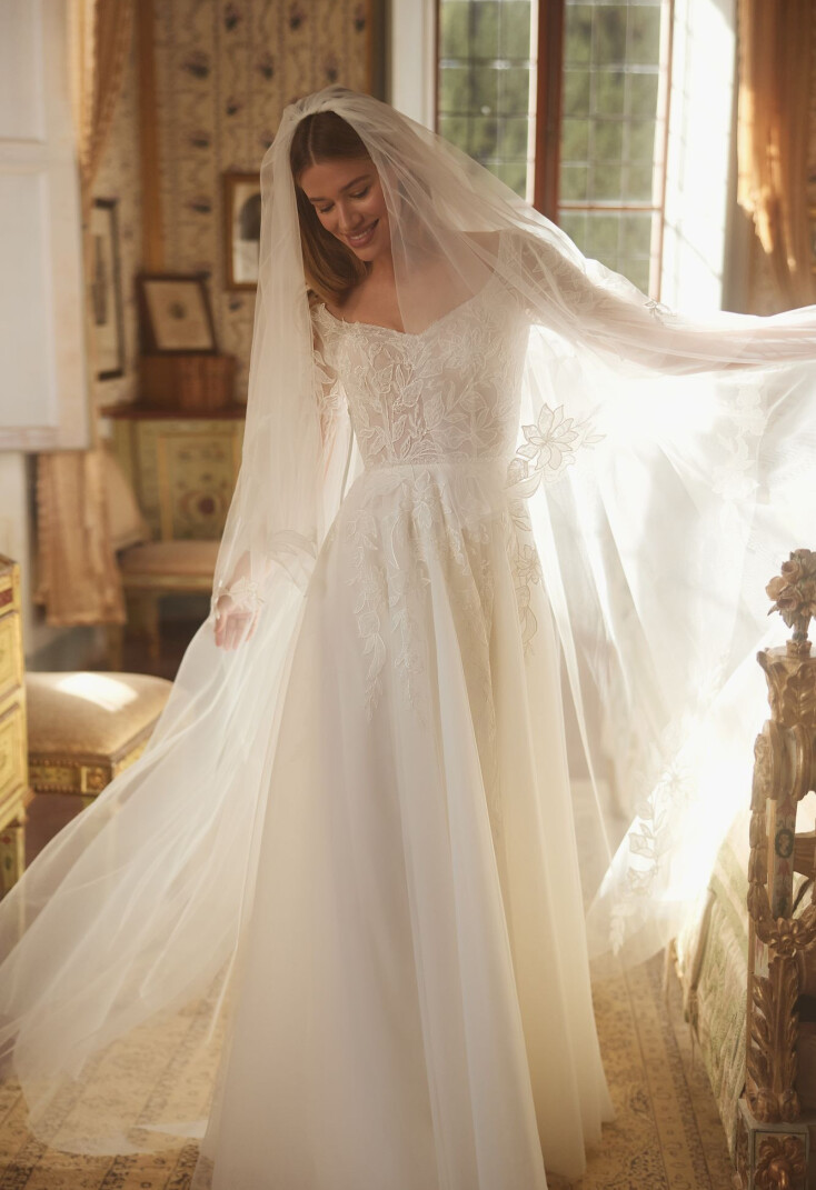 Touching and charming, like a graceful swan, the bride will walk with a light smooth gait to her beloved one, at the solemn wedding ceremony, in an A-line dress in ivory color. The semi-transparent corset is made with a heart-shaped cutout in the front. The back of the corset has a V-shaped neckline, below the level of the shoulder blades. The top is decorated with embroidered floral lace. It is fastened in the center of the back panel with a hidden zipper. The puffy skirt has a luxurious train. The top layer of the skirt is made of tulle, which is decorated with embroidered lace. The skirt is fastened in the center of the back panel with a hidden zipper. The look is complemented by long and airy fluffy sleeves, which are decorated with delicate lace. This dress is also available in the light skin version.