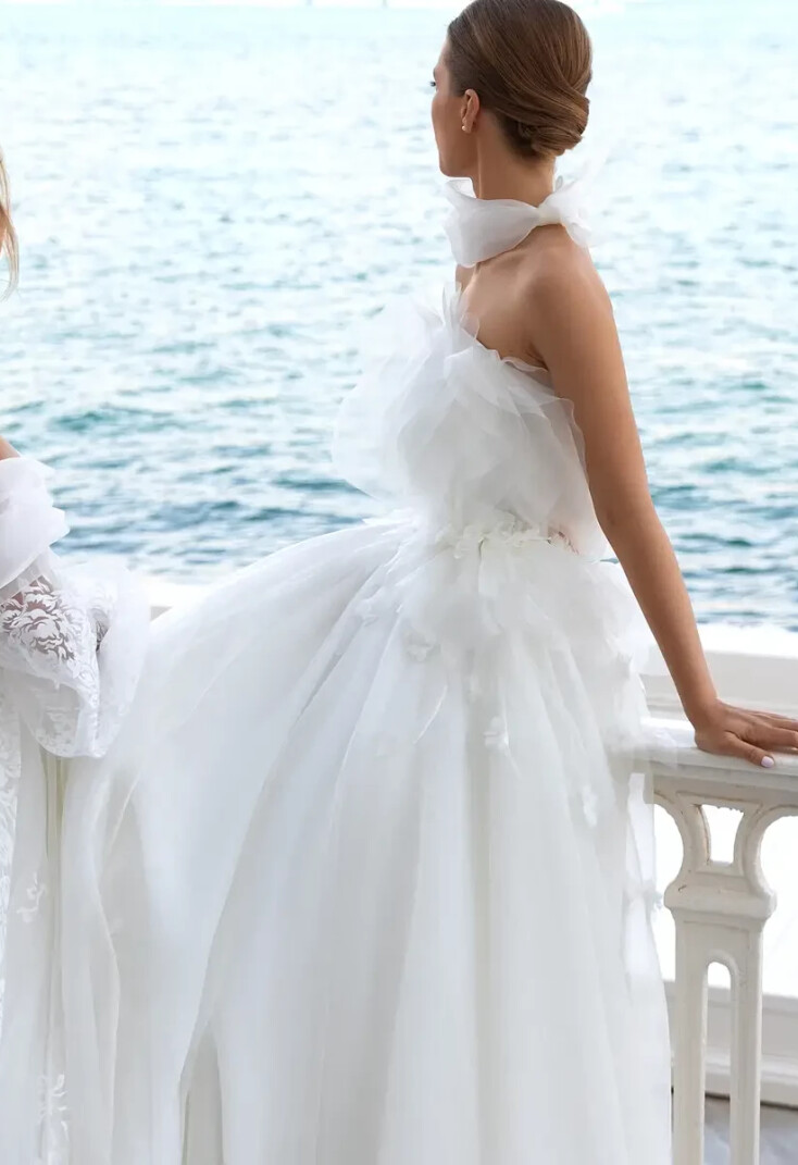 Light, airy and very touching wedding dress. The model is made of a thin snow-white organza. The bride in such dress will look angelically pure and innocent. The corset has a straight shape and is generously draped with fabric. The appliques of volumetric flowers serve as an additional decor, once again reminding of the tenderness and trepidation of the newlywed. There is the sheer shortened corset on the back, leaving the shoulder blades open. The fasteners are invisible hooks.