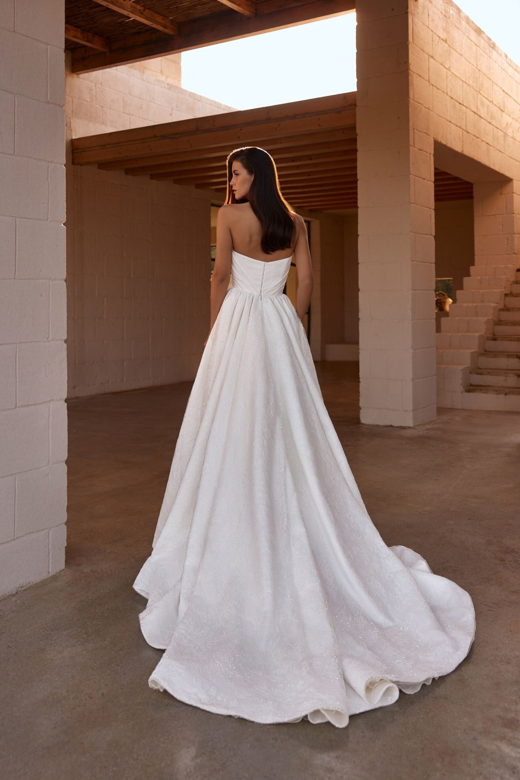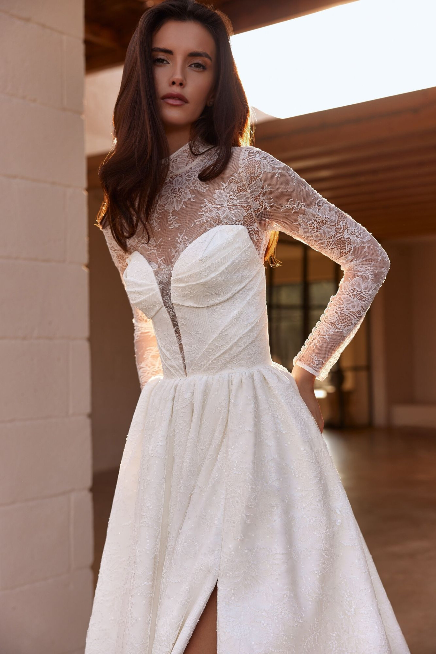 A-line silhouette gown in ivory – a sophisticated blend of classic elegance and feminine allure. The gown creates a stately, graceful look with a soft waist accent and flowing fabric movement. The corset, crafted from satin and covered with delicate lace, is decorated with diagonal draping that enhances texture and refines the silhouette. The sweetheart neckline with a central V-shaped insert accentuates the décolleté, adding gentle charm. The slightly concave back sits below the shoulder blades for a perfect fit, with a center hook-and-eye fastening for comfort. The voluminous skirt with train, made of satin and overlaid with fine lace, gently falls in folds for a luxurious effect. A right-side slit adds lightness and dynamic movement, while the invisible back zipper preserves clean lines. The gown can be paired with a removable lace bodysuit to transform the look and enhance its romantic appeal.