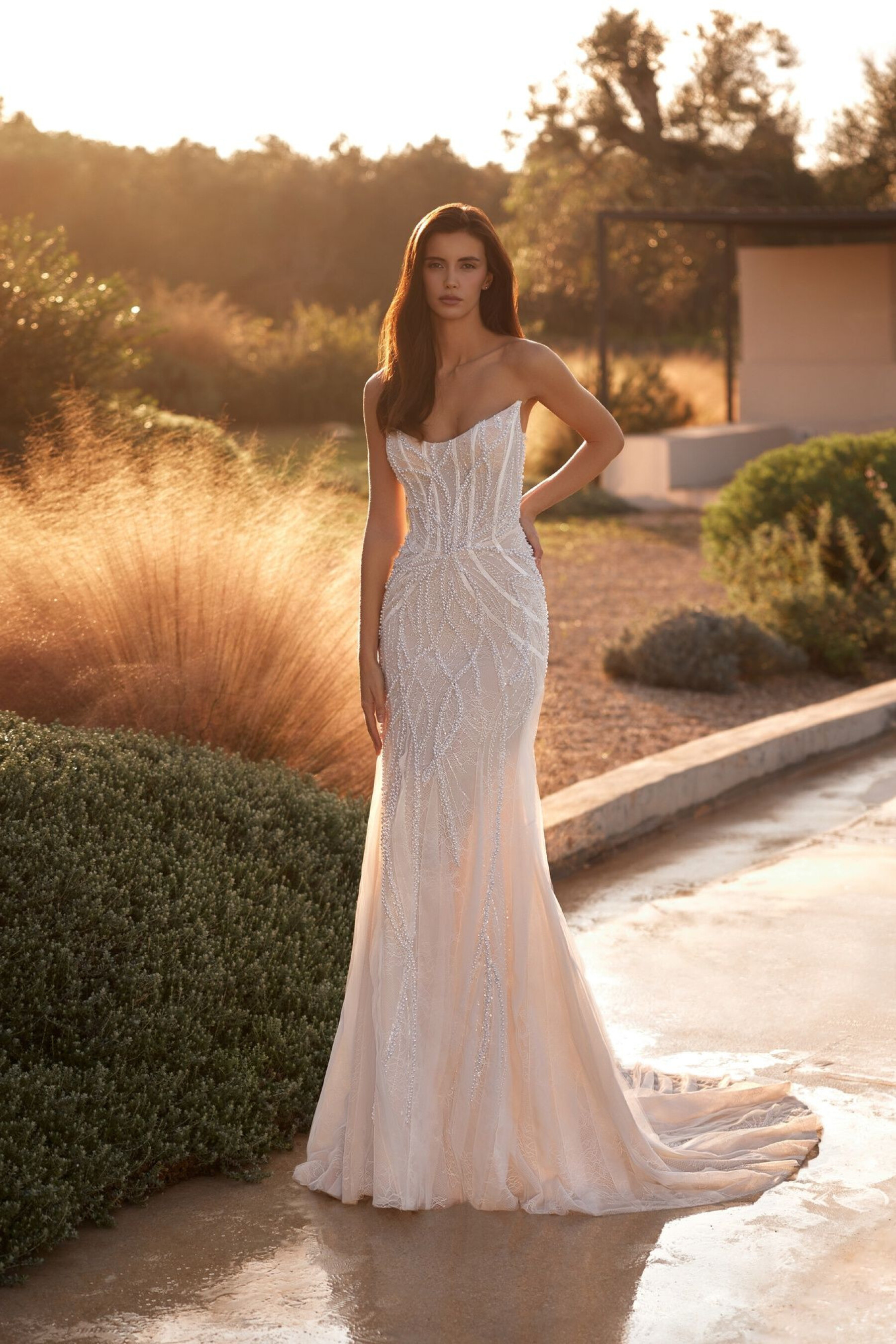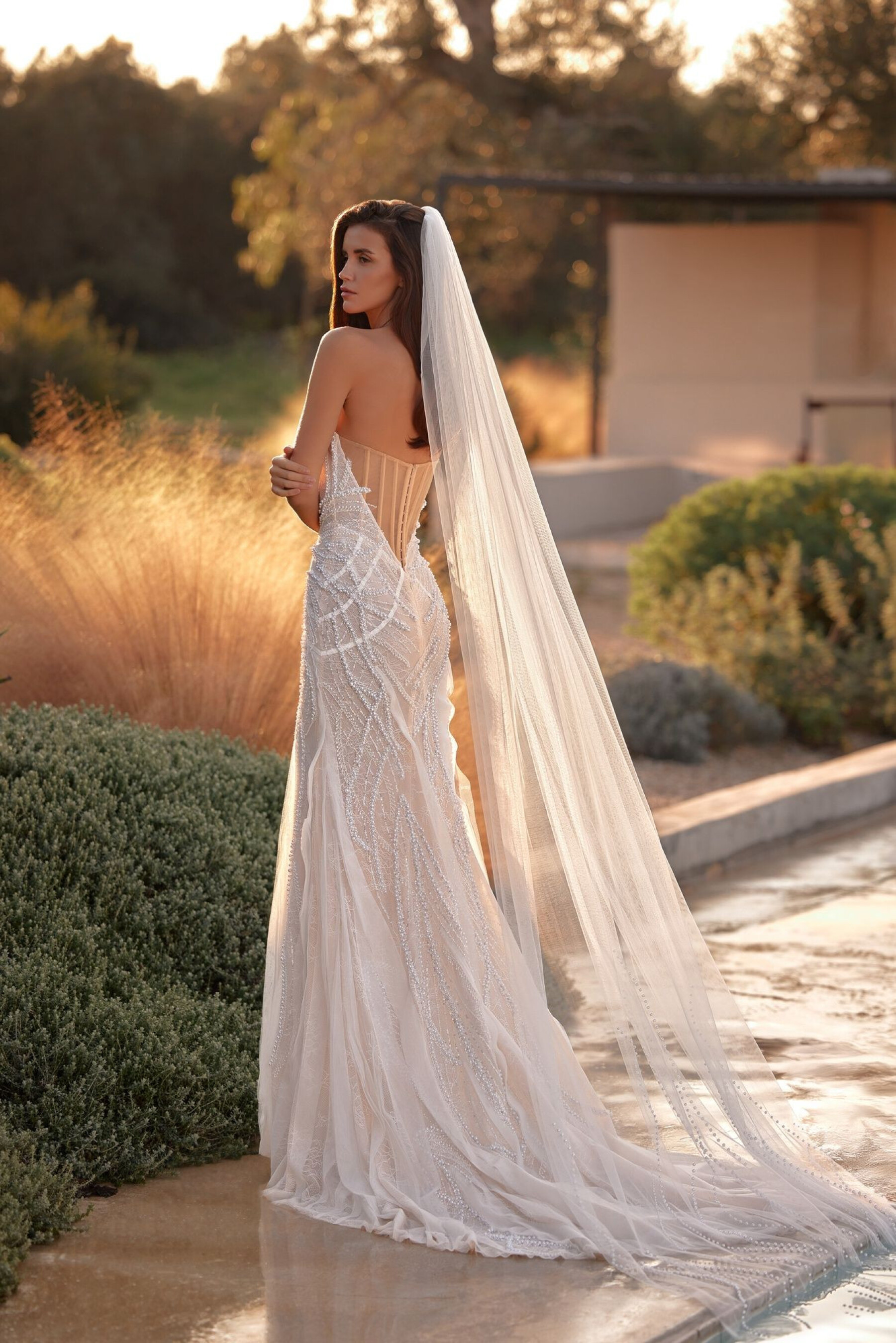 A mermaid silhouette gown in light skin – combining sensuality, modern elegance, and refined texture. The dress hugs the figure, emphasizing natural curves and creating a graceful and radiant bridal look. The semi-sheer corset with an oval front neckline delicately highlights the décolletage. The slightly concave back, lowered below the shoulder blades, ensures a perfect fit, while hook-and-eye fastenings provide convenience. Constructive corset lines, accentuated with decorative strips, create a graphic effect, while the nude mesh back gives a gentle illusion of exposure. The fitted semi-sheer skirt with embroidered lace mirrors the top’s lines and transitions into a lower section adorned with tulle ruffles for lightness and volume. The gown is fully decorated with lace, hand-beaded embroidery, and pearls, adding radiance and noble charm. The invisible back zipper keeps the silhouette clean. The model can also be made in ivory with a skirt lining.