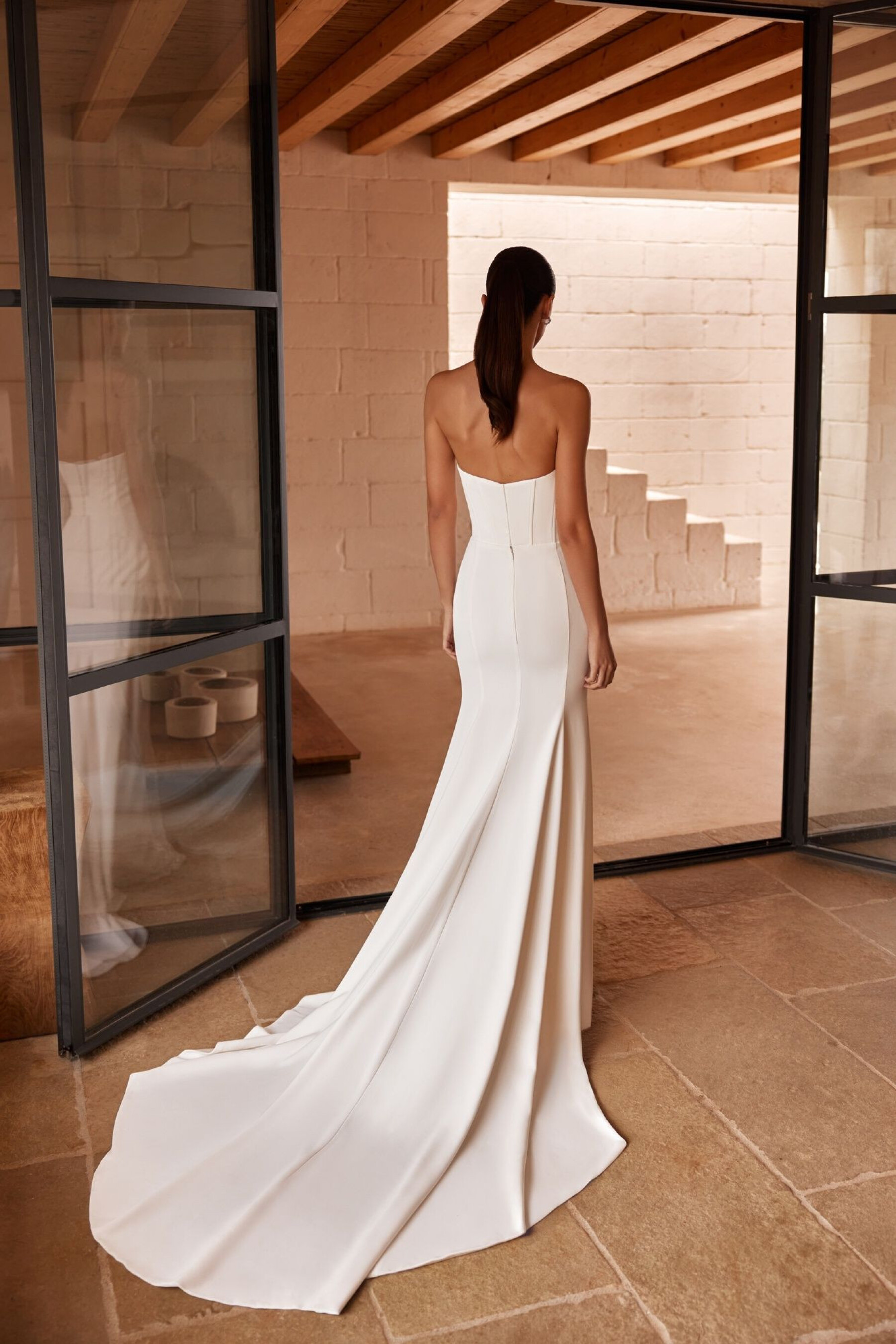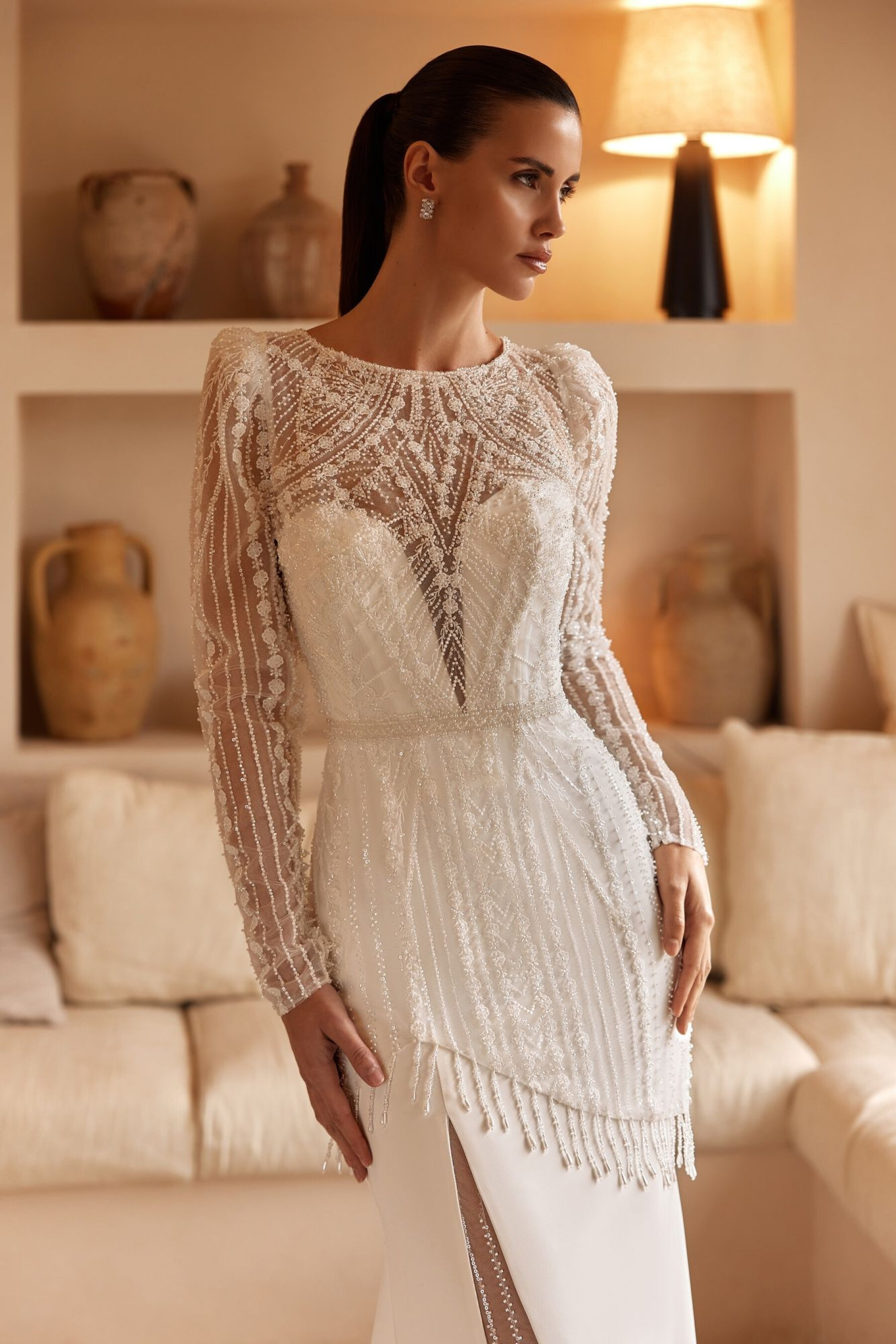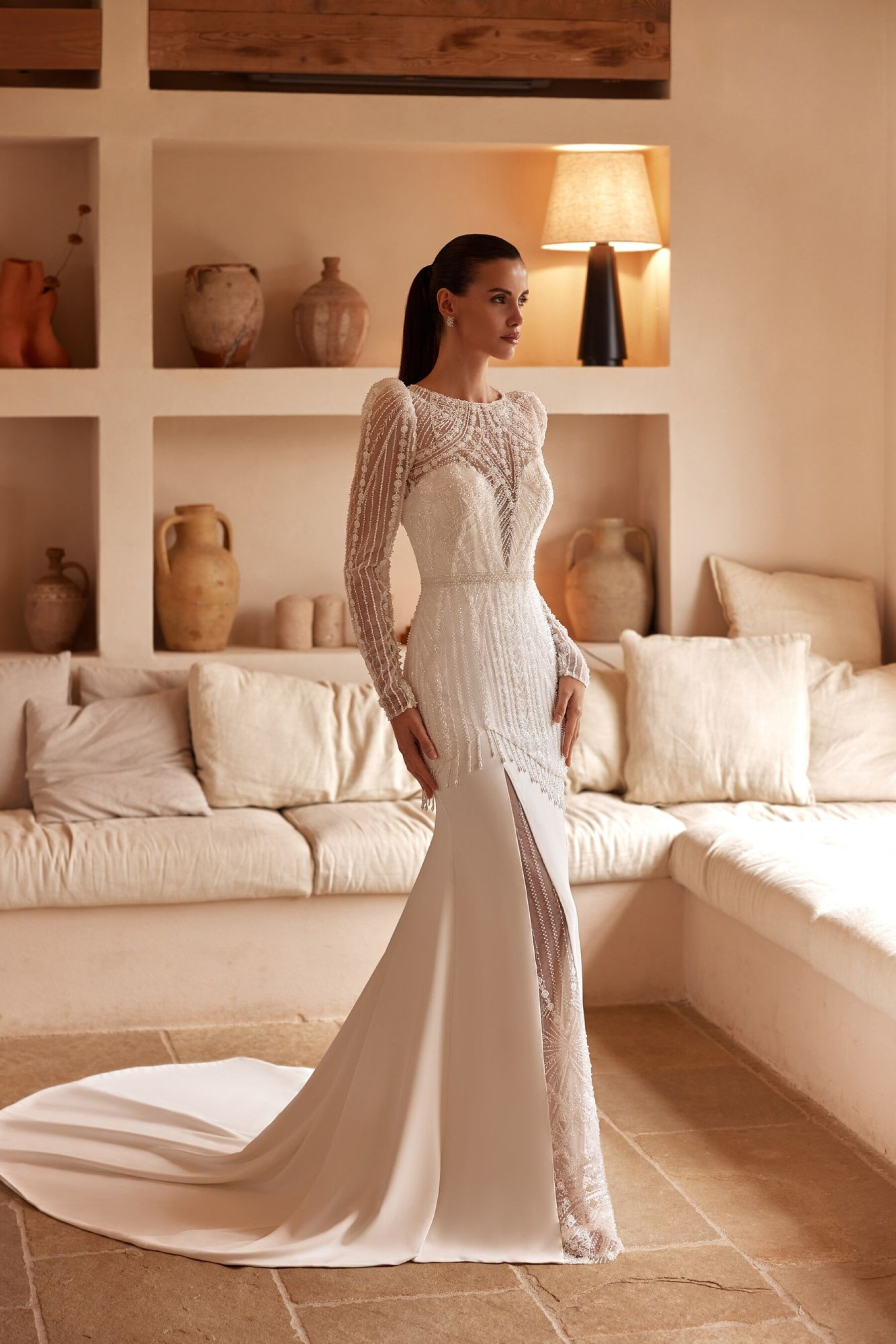 A mermaid silhouette gown in ivory – a blend of classic elegance and modern refinement. The dress gently hugs the figure, emphasizing natural curves and creating a harmonious, ceremonial bridal look. The sweetheart corset features a transparent panel down to the waistline, adding lightness and softness to the silhouette. Hook-and-eye fastenings ensure comfort and a perfect fit. The fitted skirt with a train highlights the waist and falls smoothly, while the lace insert along a raised seam adds a refined accent and texture. The invisible back zipper maintains clean lines. The look is complemented by lace bolero 01493B.