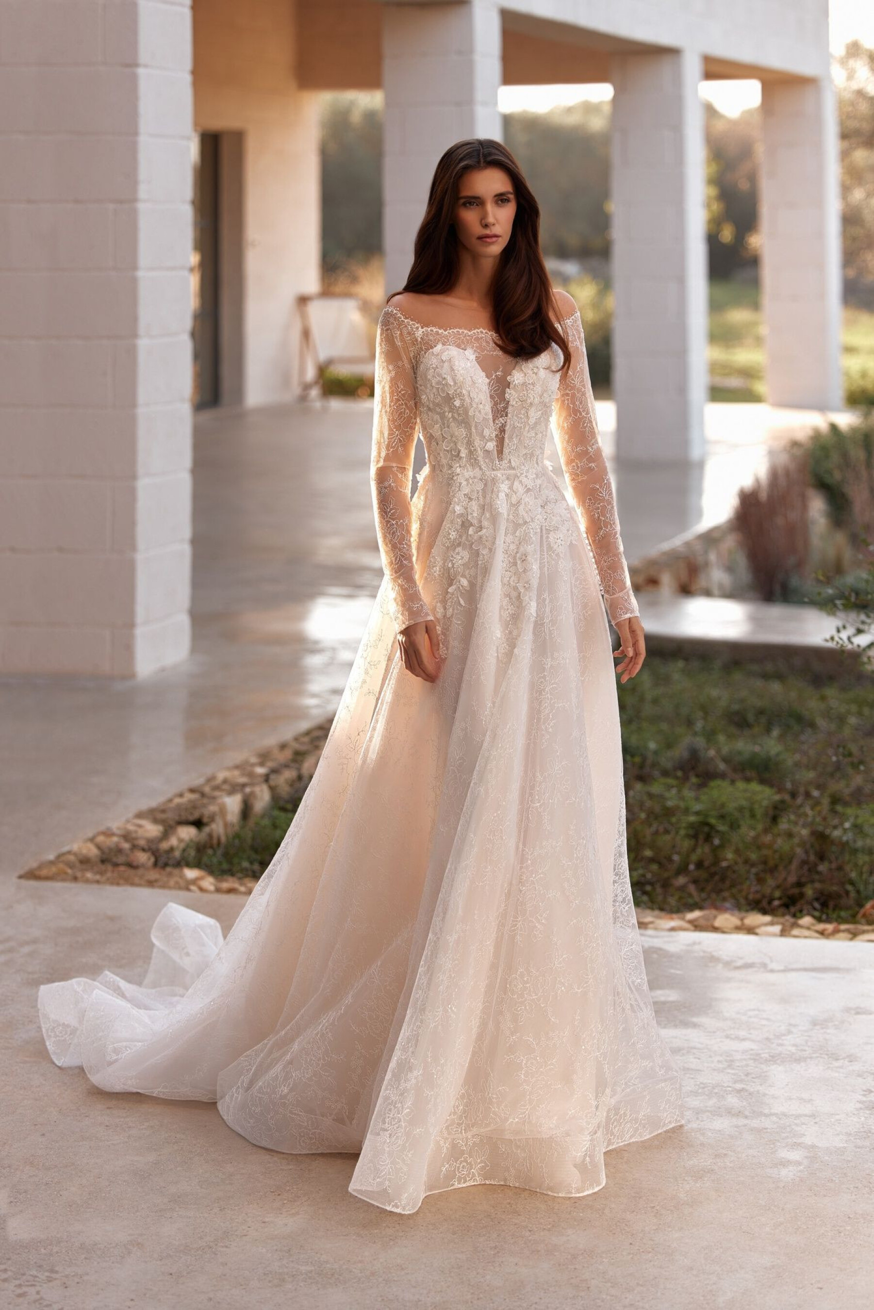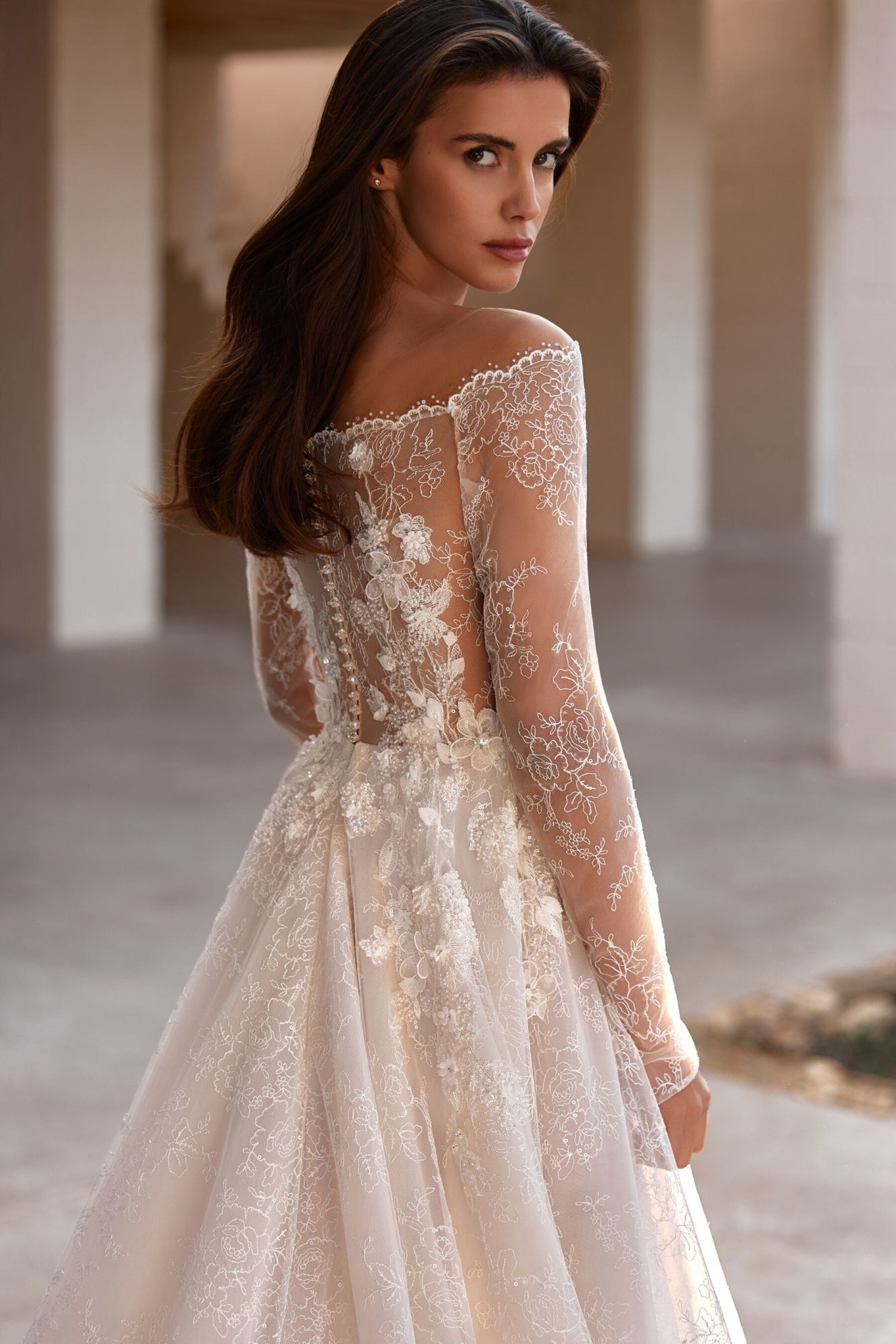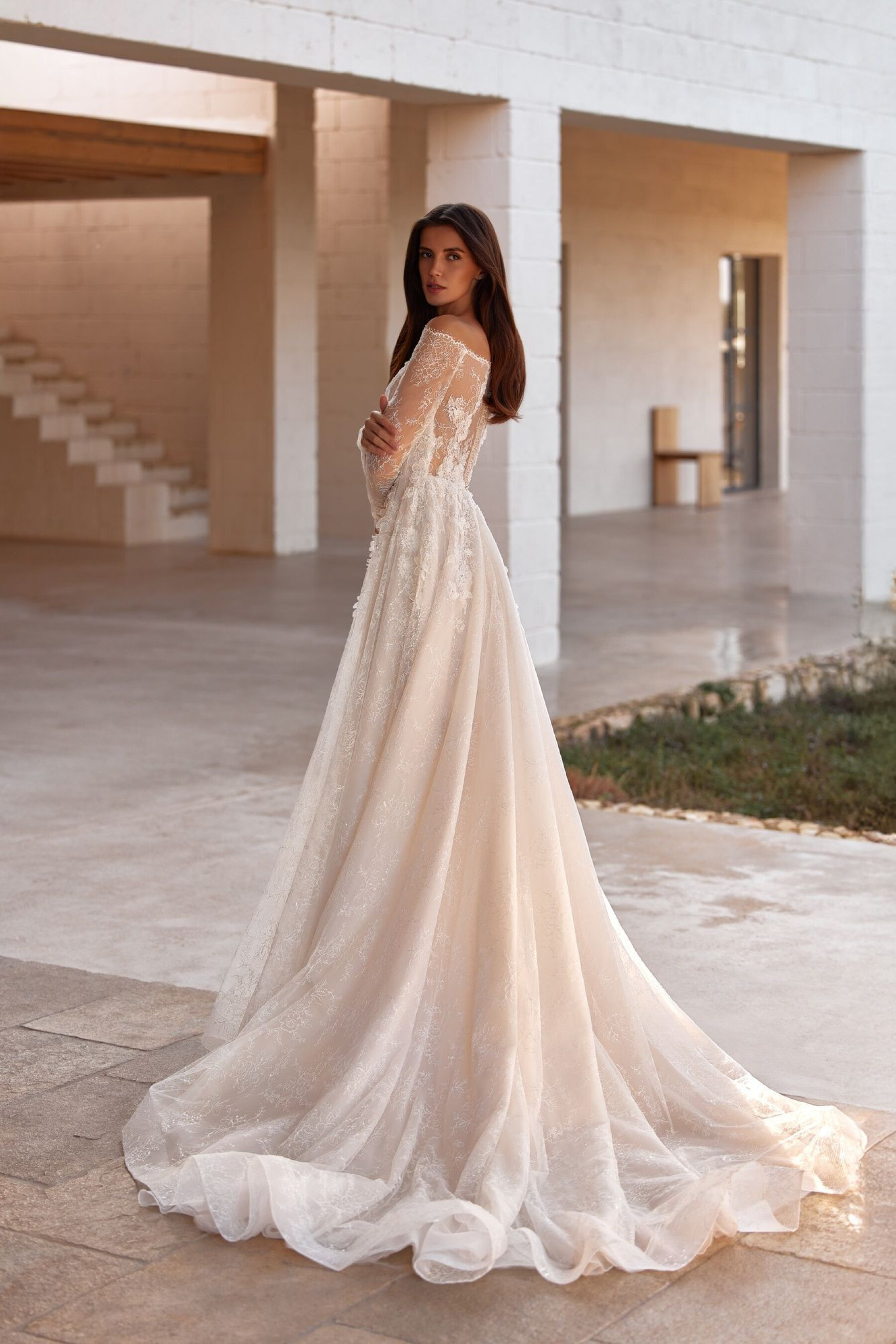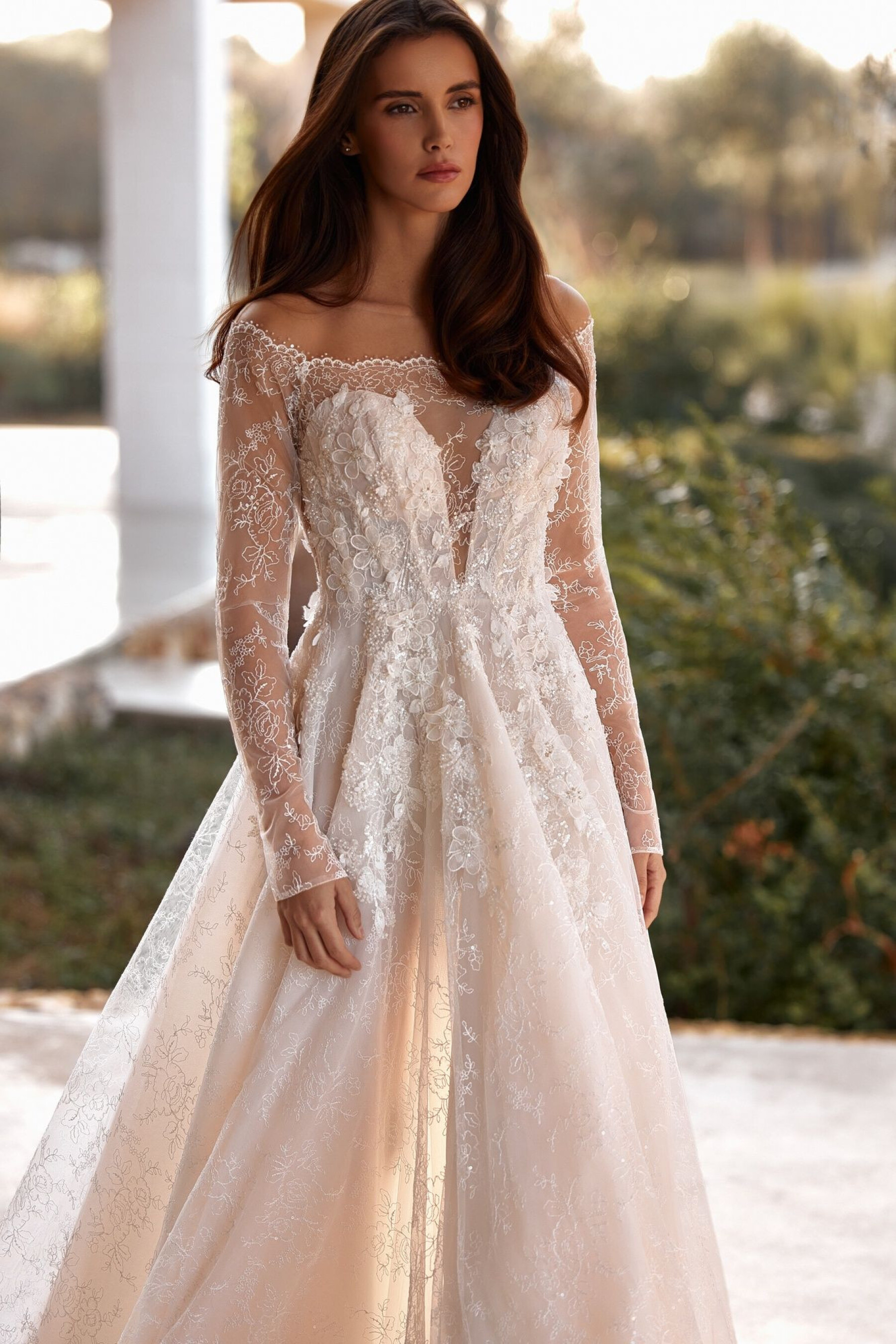 An A-line silhouette gown in light skin – combining romantic delicacy and modern refinement. The dress creates an airy, graceful bridal look, accentuating the waist and adding visual volume. The lace top imitates a raglan neckline extending into sleeves, revealing the underlying layer with a deep sweetheart neckline down to the waist. The back has a straight cut to the shoulder blades, with button-and-loop fastenings ensuring neatness. The top is decorated with hand embroidery, lace, and 3D flowers, creating a delicate, sparkling accent at the décolletage. The full semi-sheer lace skirt falls softly, with the upper layer decorated in embroidery continuing the top’s motif. The invisible back zipper ensures clean lines. The model can also be made in ivory with a skirt lining.