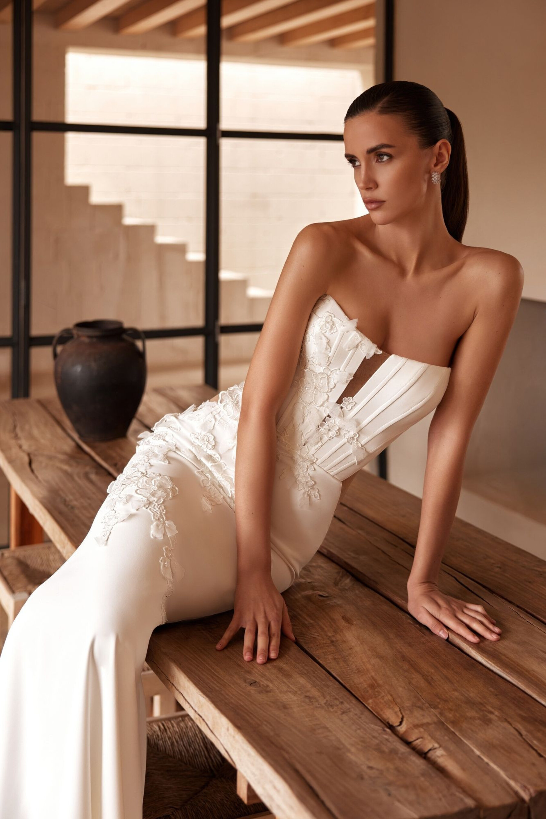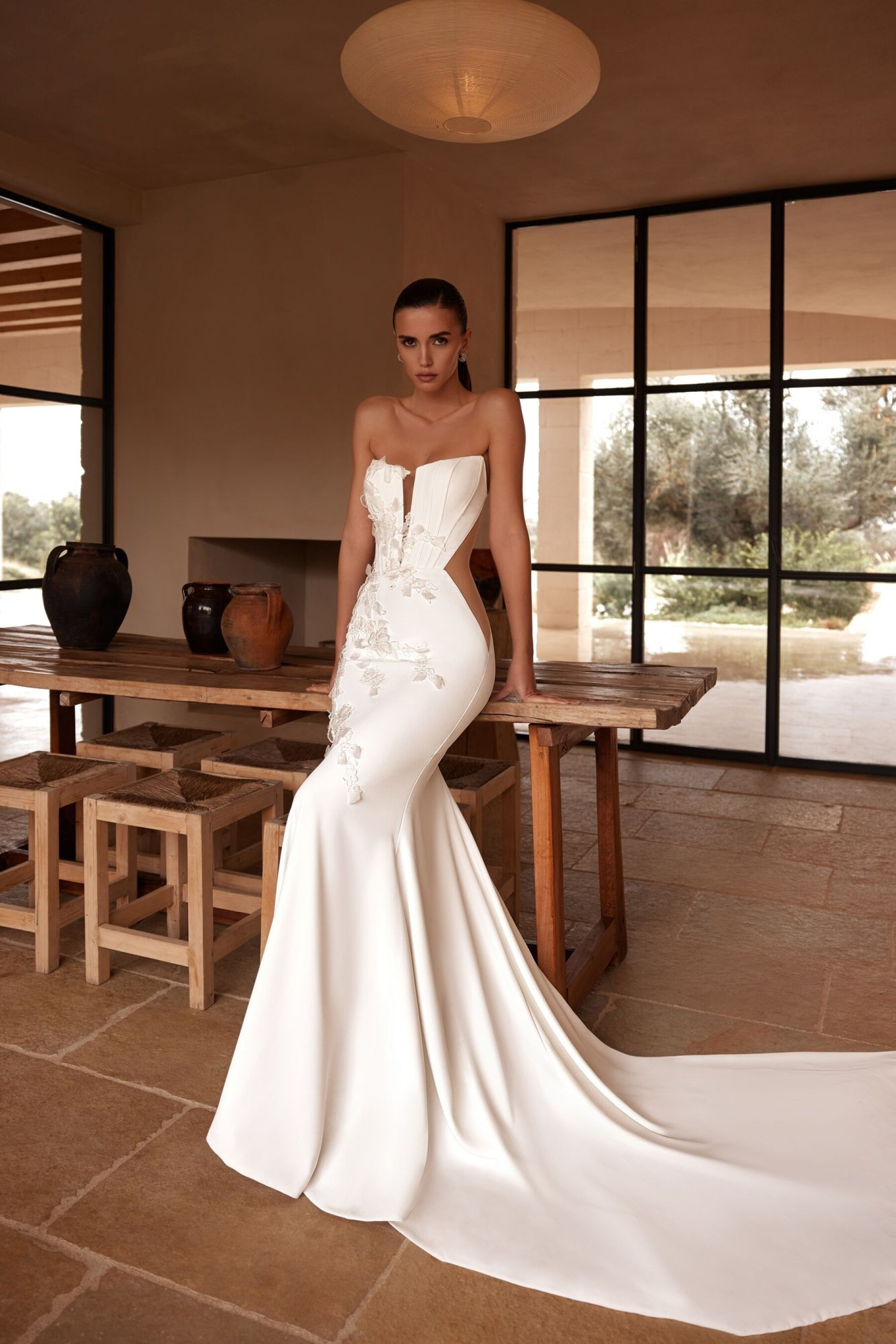 A mermaid silhouette gown in ivory – combining modern sensuality, elegance, and refined texture. The dress gently hugs the figure, highlighting natural curves and creating a graceful, ceremonial bridal look. The boat-neck corset is made of suit fabric with a central V-shaped nude insert. The slightly concave back at shoulder level and nude mesh side panels add lightness and a subtle exposed effect. Hook-and-eye fastenings ensure a perfect fit. The fitted skirt with an elegant train is made of suit fabric, softly hugging the hips and adding fluidity and harmony to the silhouette. The invisible back zipper maintains clean lines. The gown is decorated with lace and 3D flowers, creating a sparkling, refined decorative accent, emphasizing femininity and elegance.