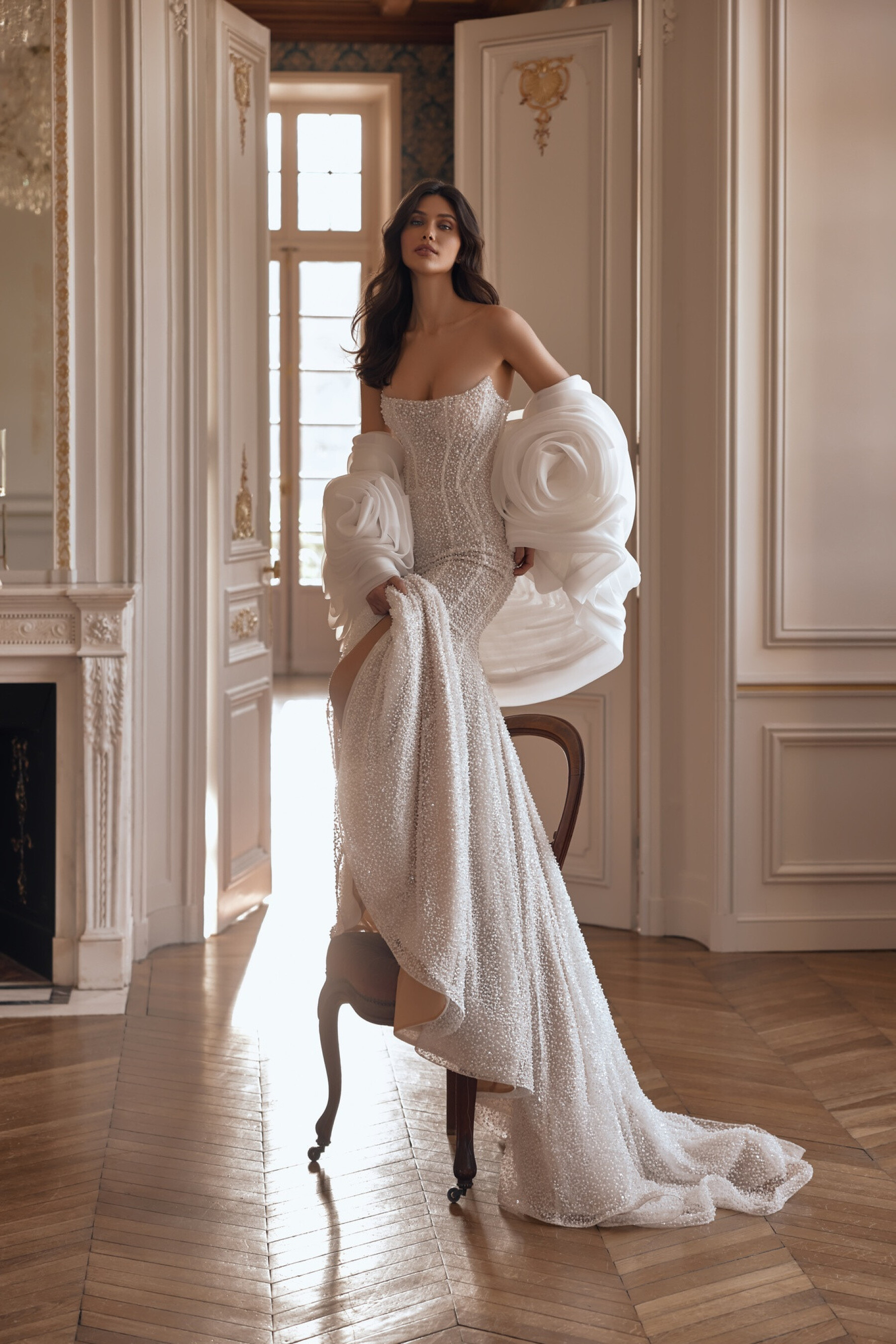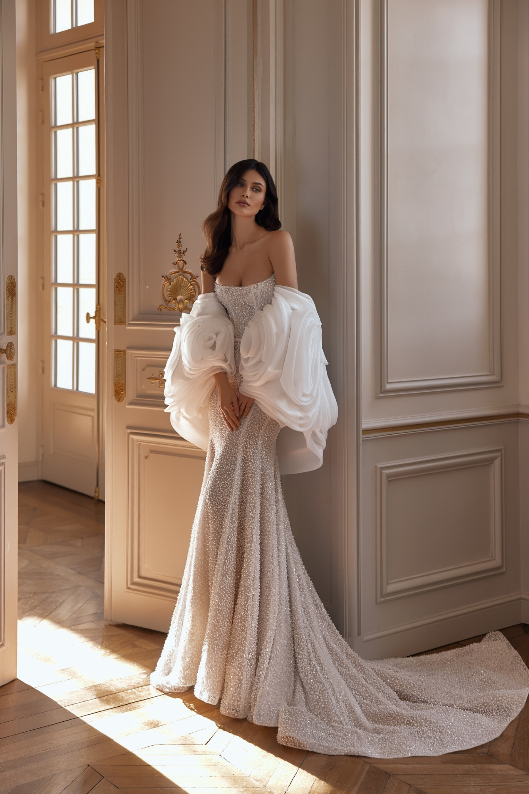 A refined mermaid silhouette gown in embroidered lace in light skin creates a “second skin” effect, highlighting the bride’s natural beauty. The boat neckline and sculpted construction lines form an elegant silhouette, while hand embroidery adds a precious sparkle. The semi-open back with concealed closure enhances the delicate impression. The look is complemented by a textured organza ruffle bolero, adding lightness and volume. A lined version and Ivory color option are available.