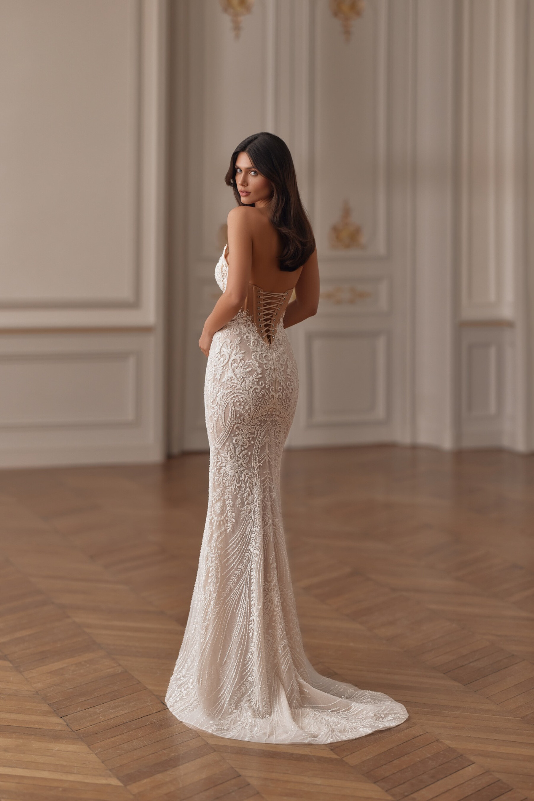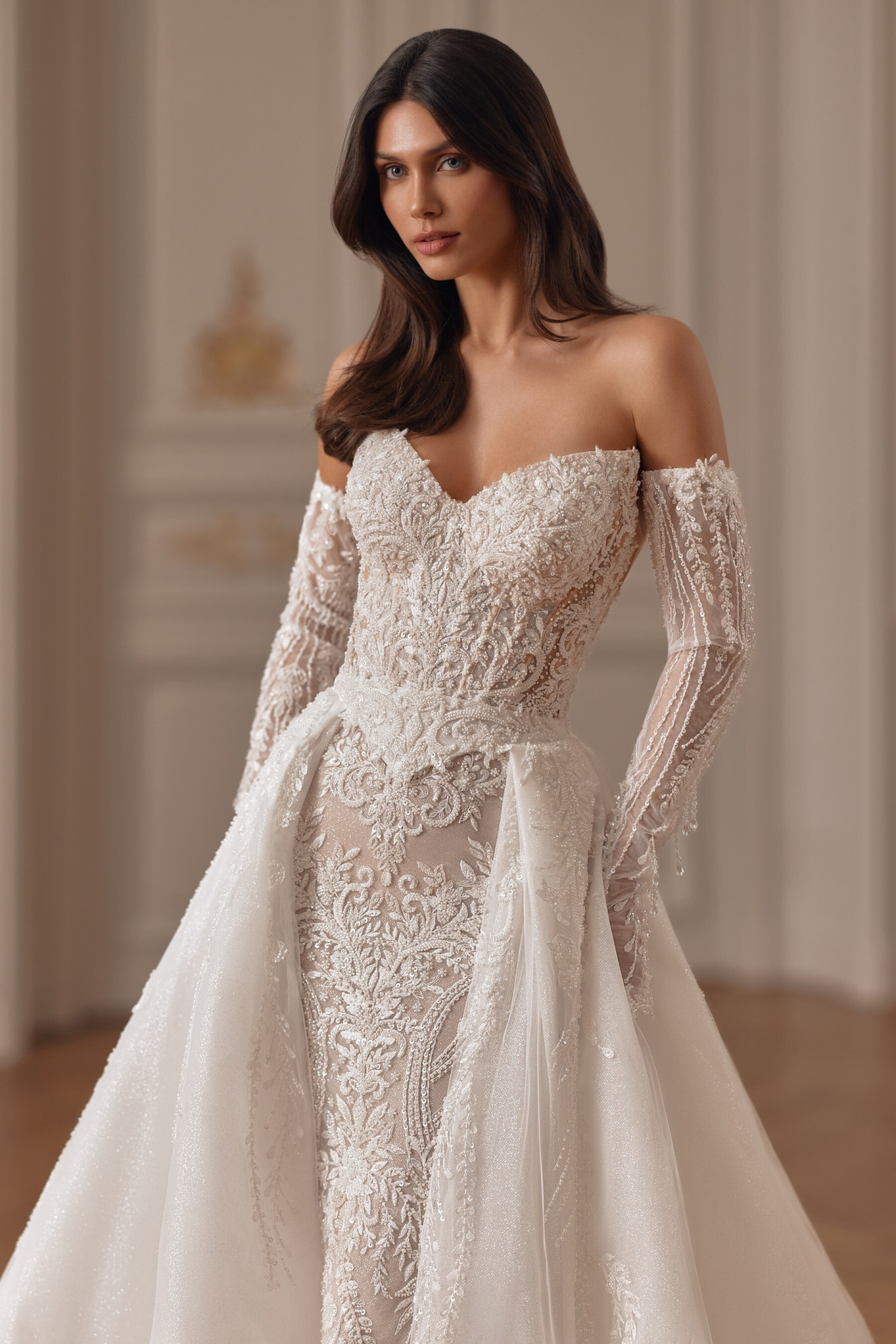 A mermaid silhouette gown in embroidered lace in light skin combines sensuality and refined elegance. The semi-sheer corset with a soft V-neckline and a nude illusion effect creates the appearance of lace on the skin. The fitted skirt with a small train emphasizes the bride’s graceful movements. The look can be transformed with removable lace sleeves or a full tulle skirt, creating different moods for the ceremony and celebration. A lined version and Ivory color option are available.