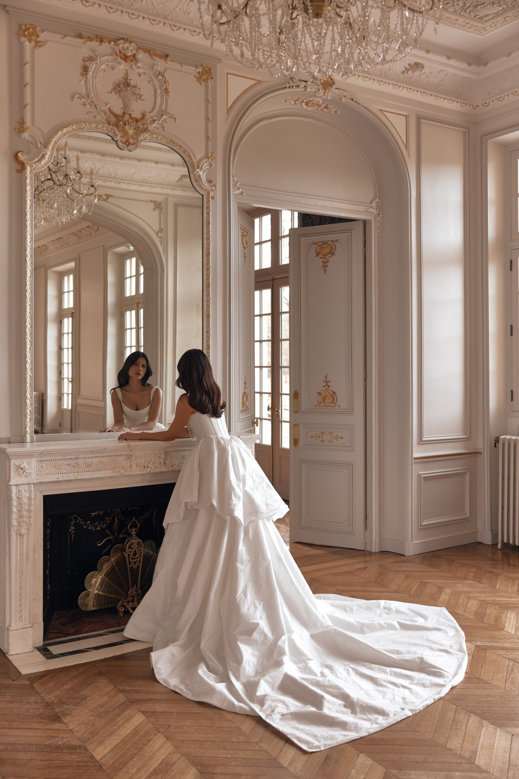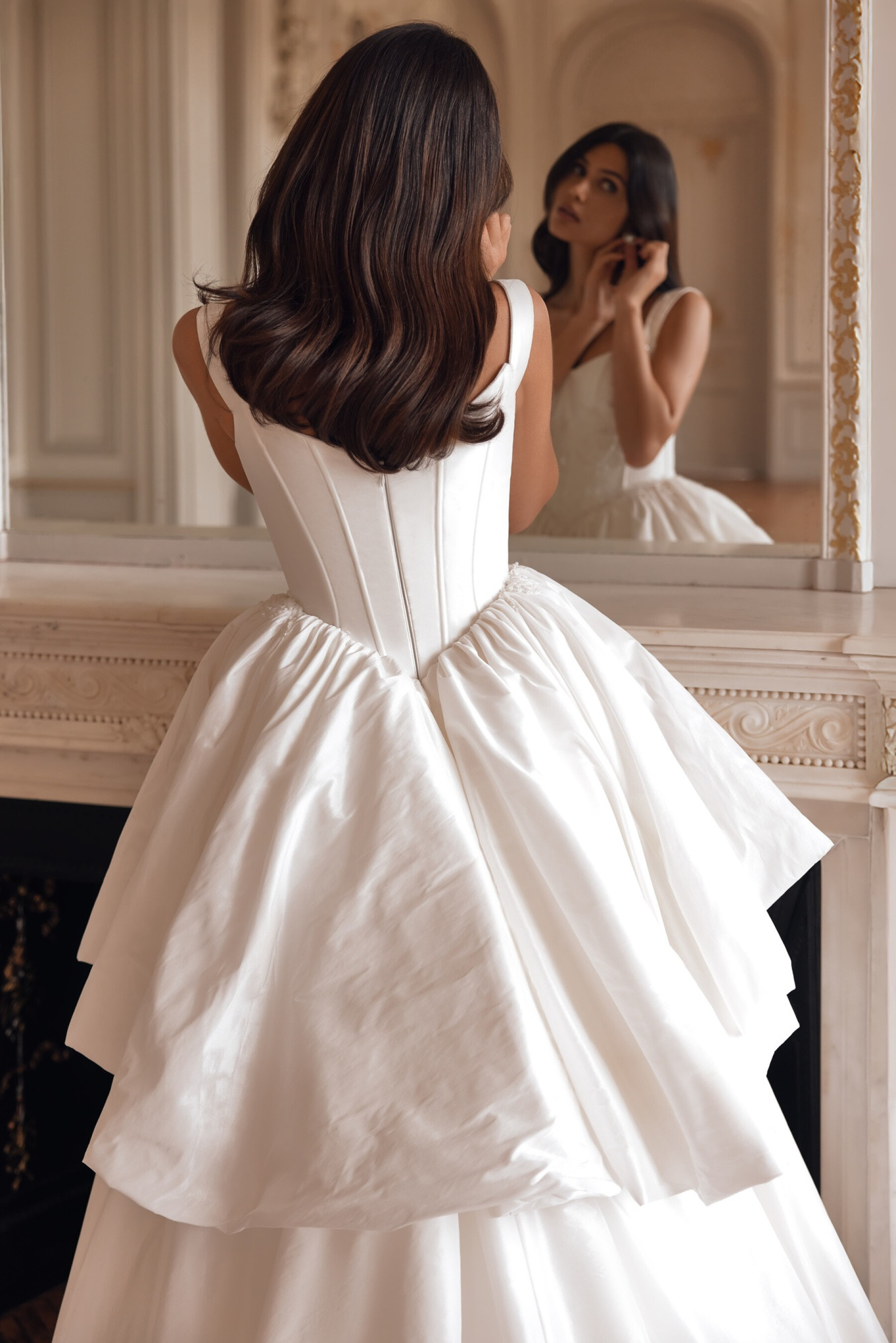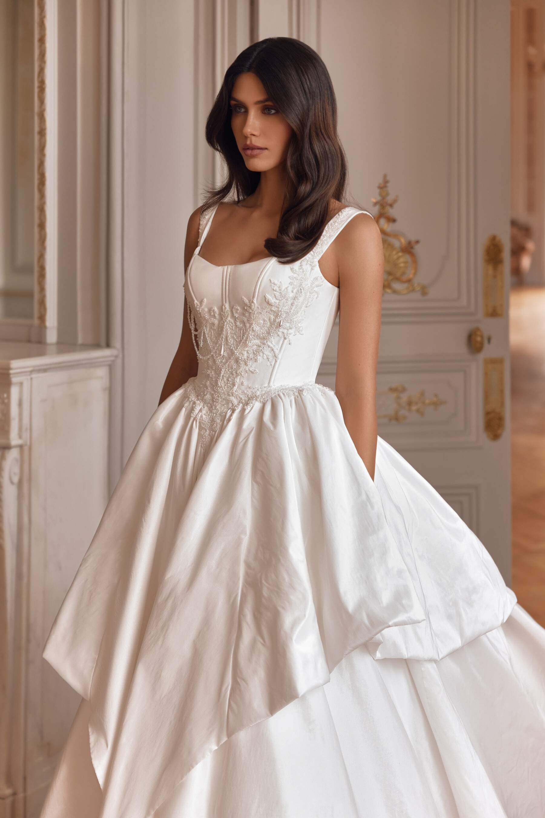 A striking voluminous gown in Ivory taffeta embodies festive grandeur and delicacy at the same time. The corset with a boat neckline and delicate short sleeves flowing onto the forearms forms a noble and restrained impression. Embroidered appliqués and hand embroidery on the bodice create a sophisticated decorative accent that shimmers with movement. The slightly concave back emphasizes graceful posture, while the full skirt with two gathered tiers adds volume and produces a majestic bridal walk. The sculpted seam line completes the silhouette, making the look truly unforgettable.