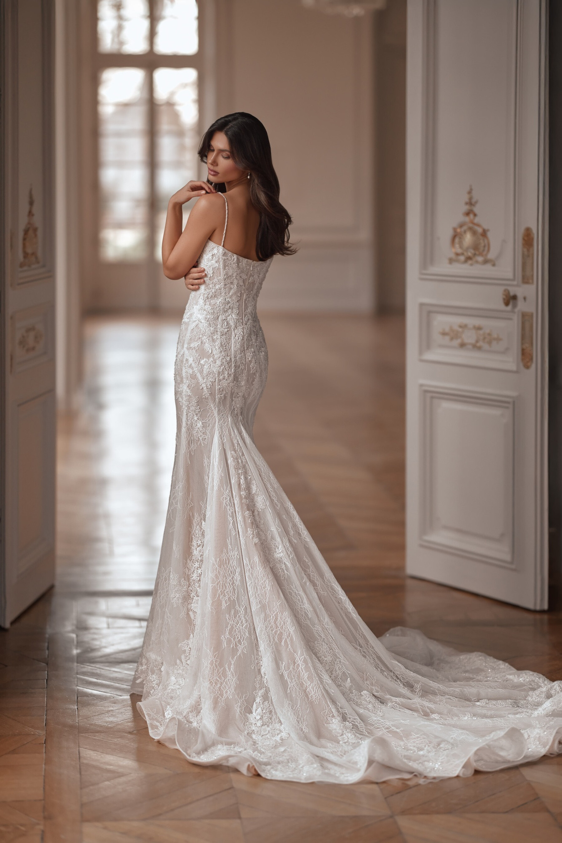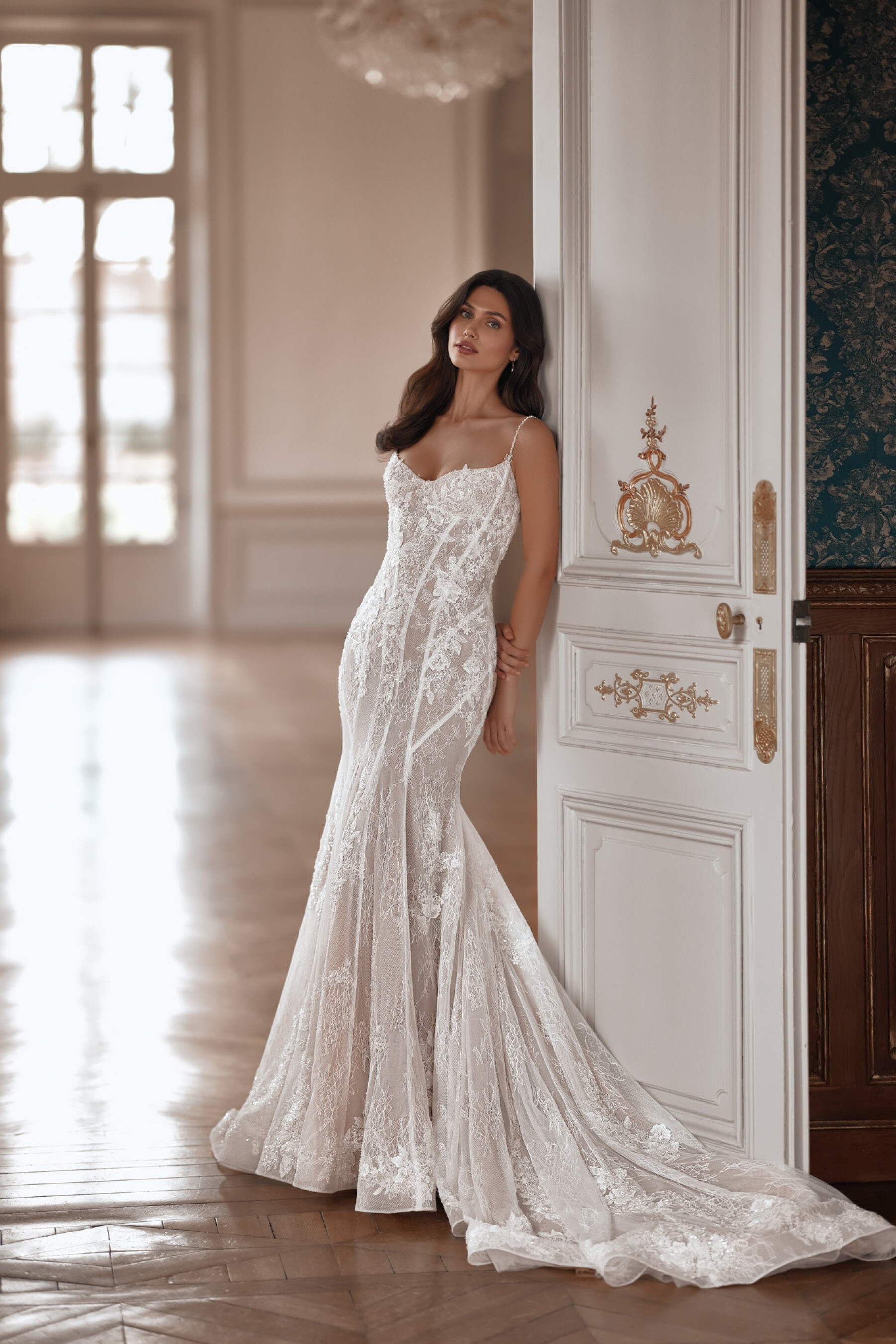 A mermaid silhouette gown in light skin lace, featuring a sweetheart corset on a cut cup with thin straps.