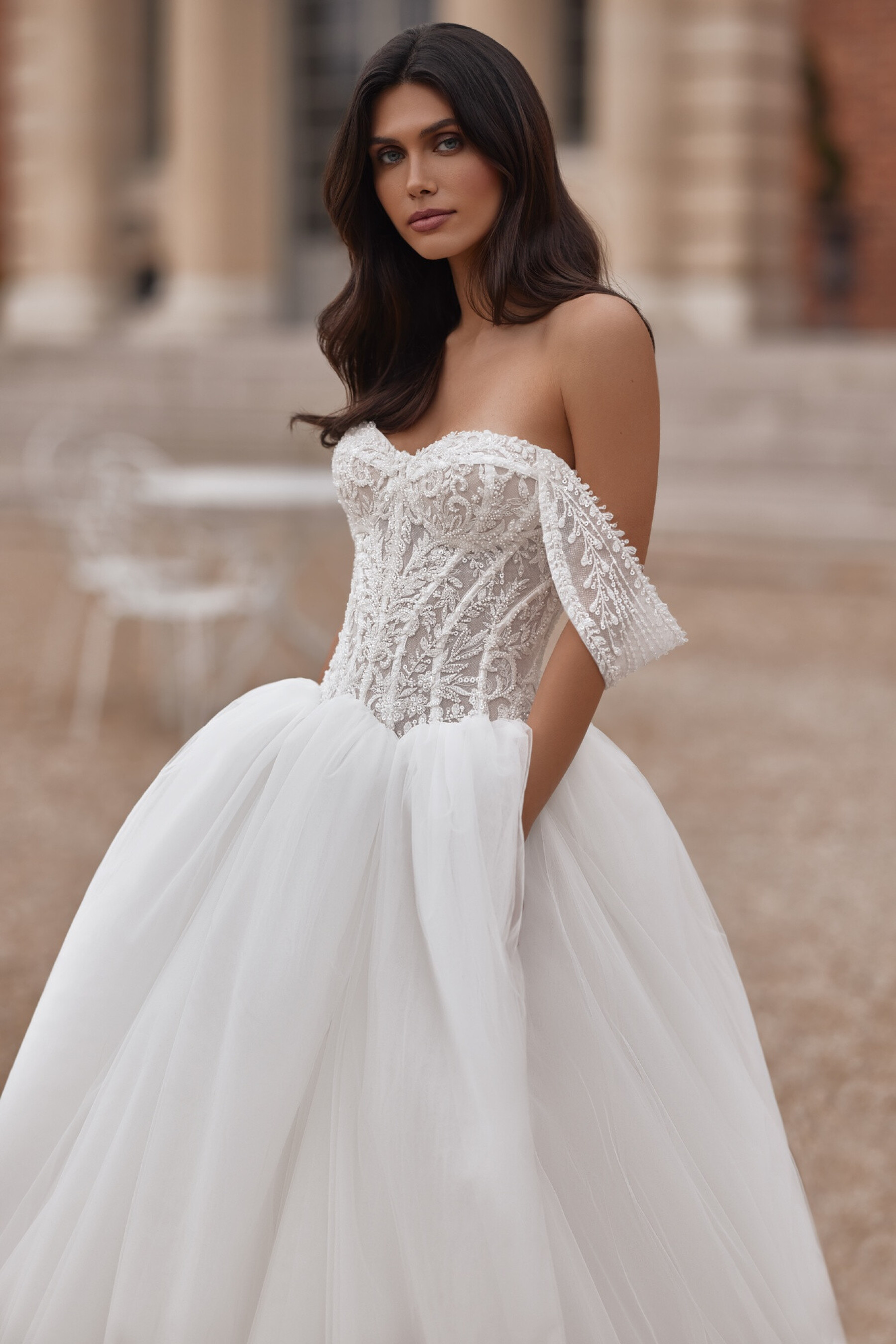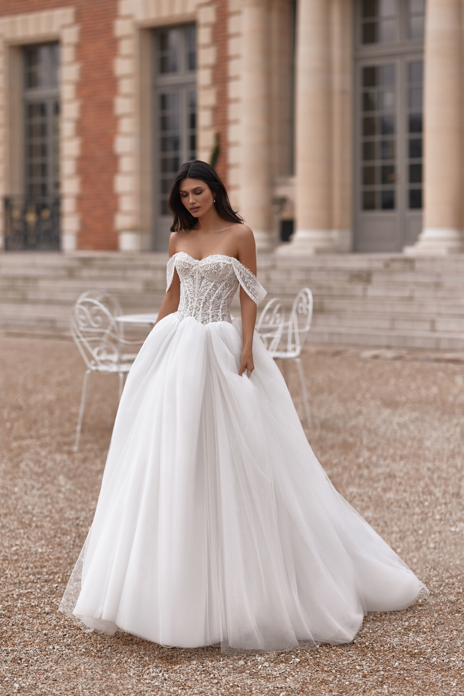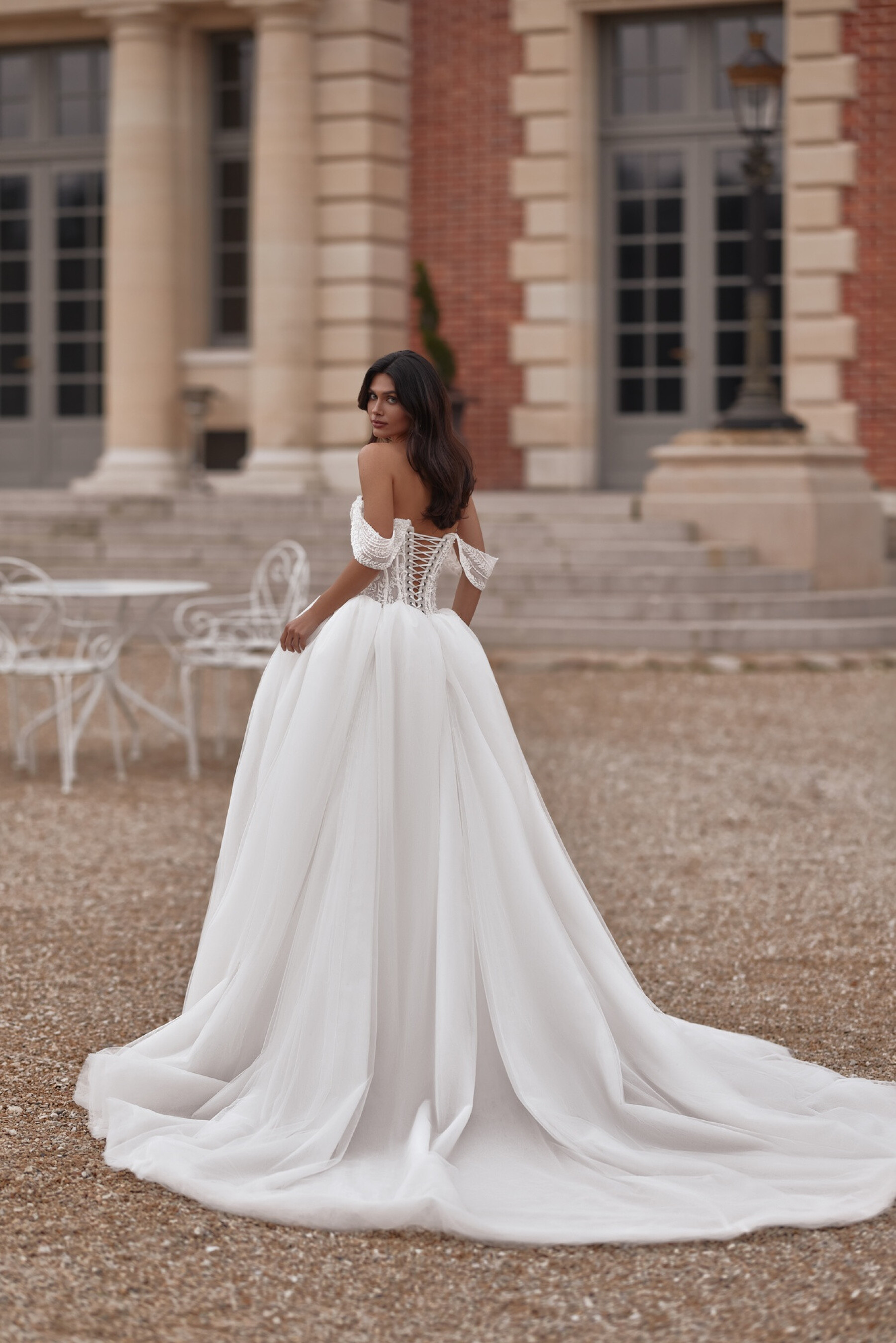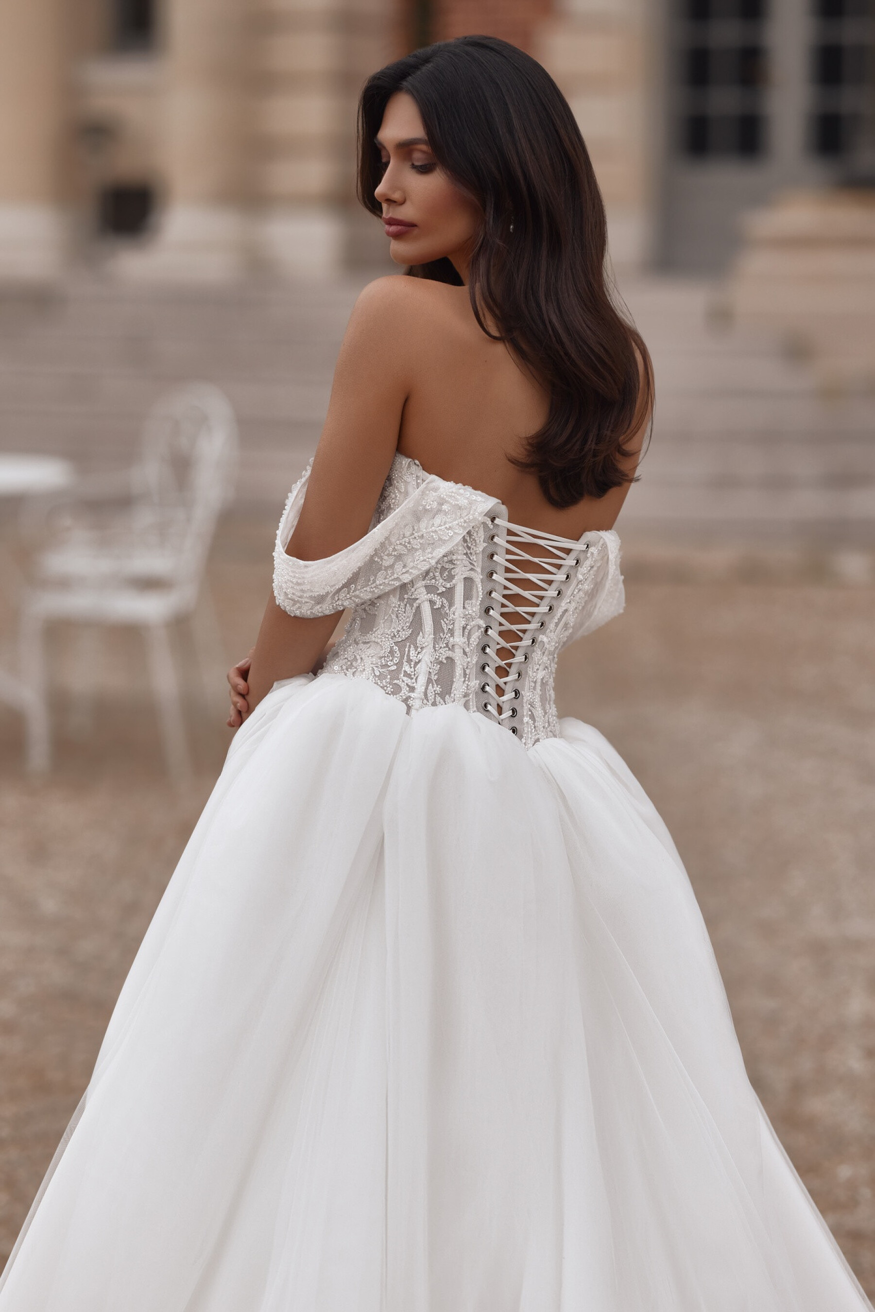 A voluminous Ivory gown with a semi-sheer sweetheart corset adorned with embroidered appliqués. The slightly concave back below the shoulder blades with eyelets and lacing creates a harmonious waistline curve. The full tulle skirt with a long train, shaped seam, and fine gathers at the top edge adds airiness and volume. Removable decorative straps with mesh and embroidered appliqués complete the look. A concealed zipper option on the corset is available.