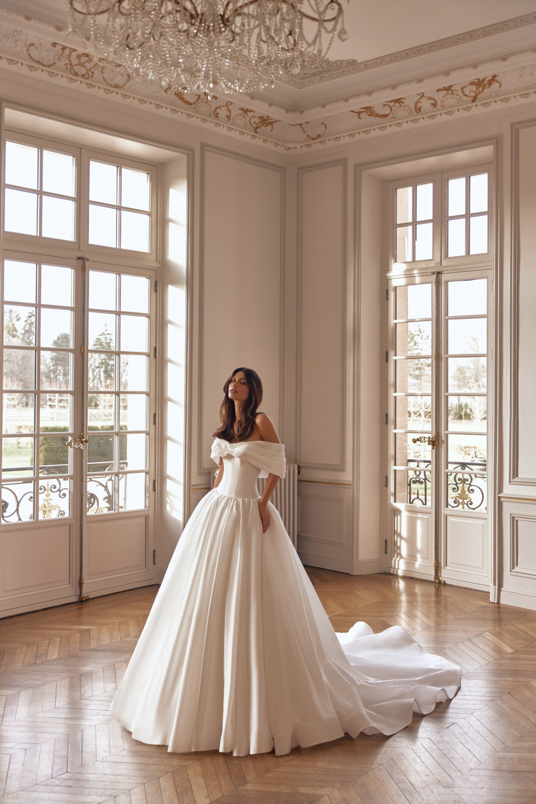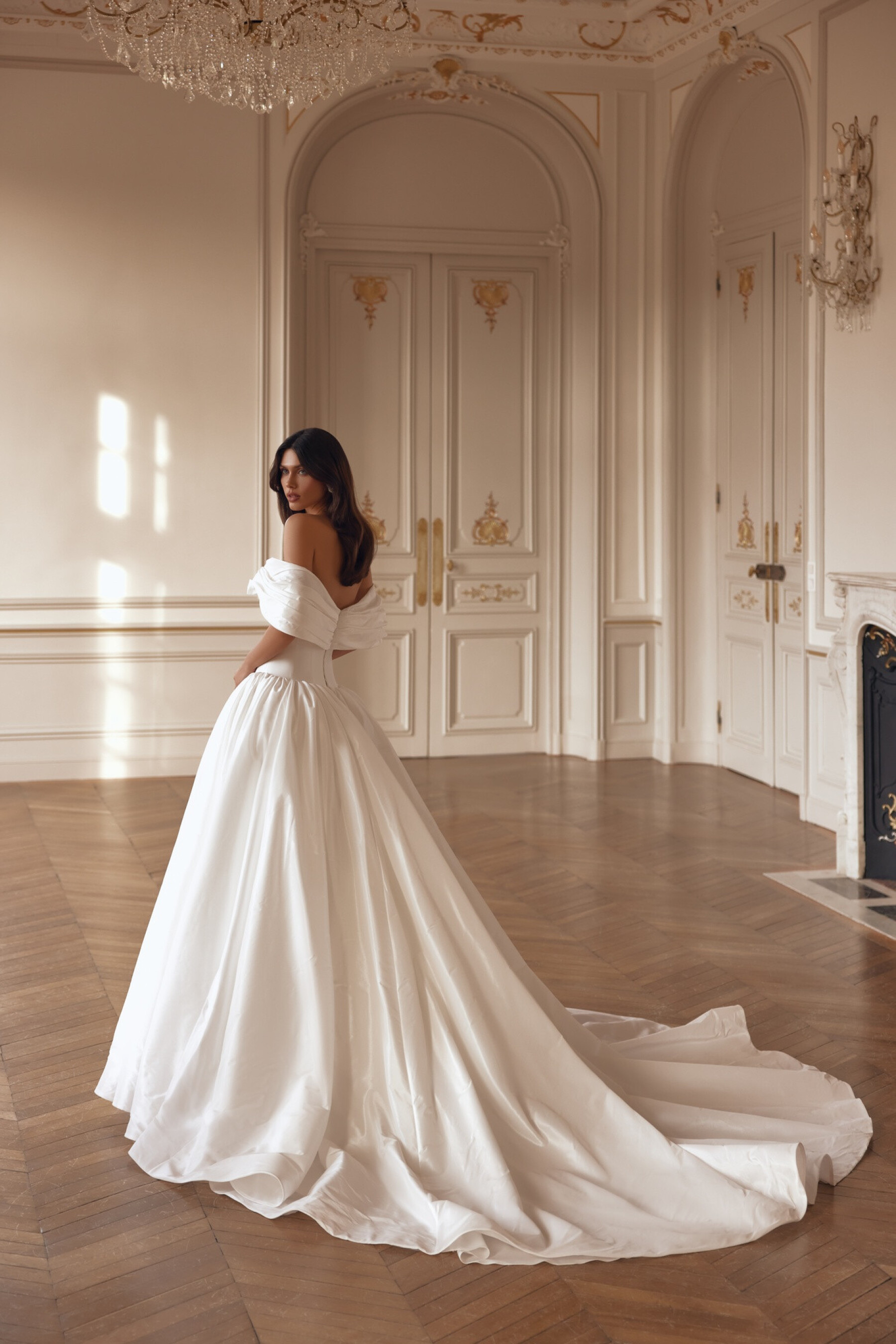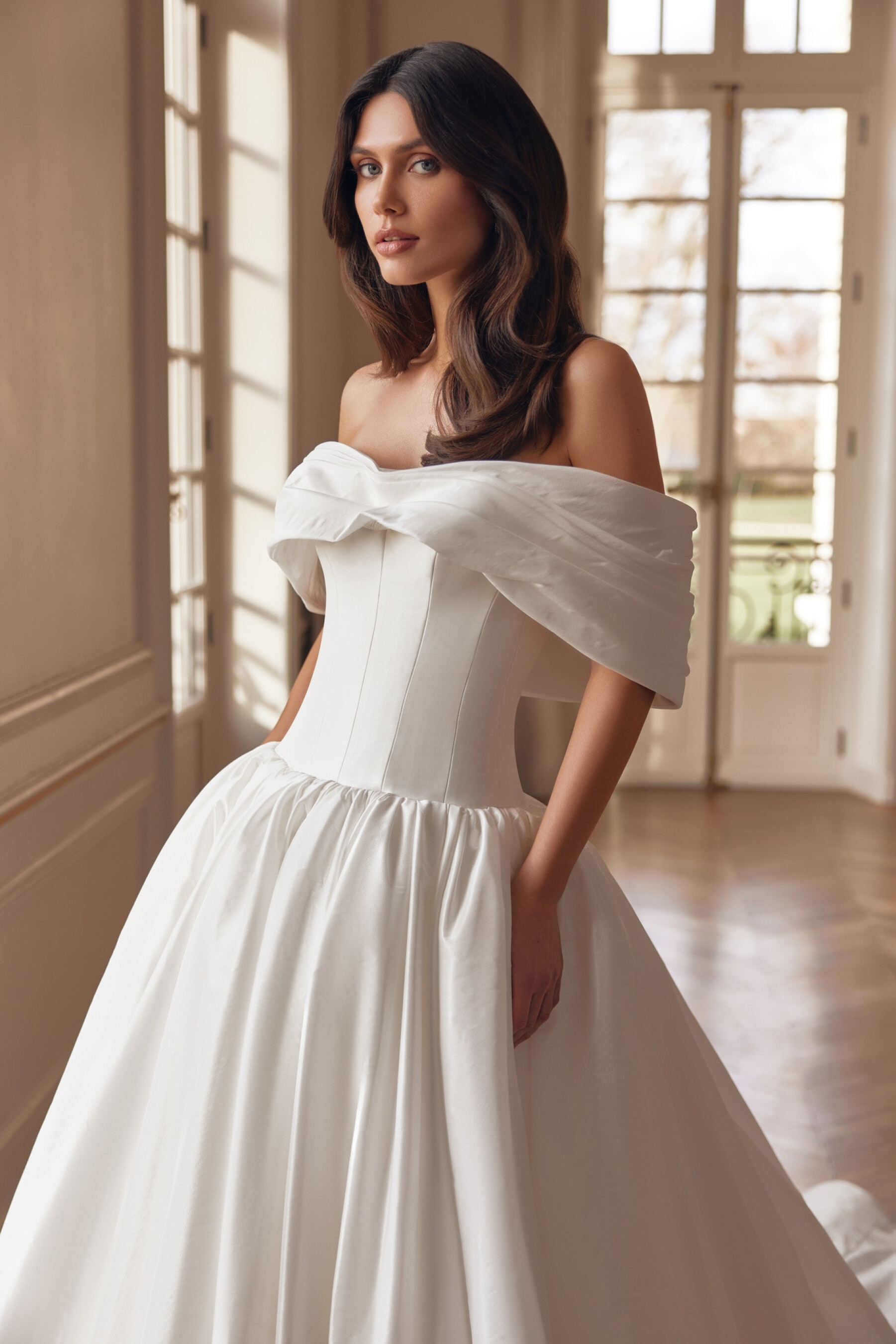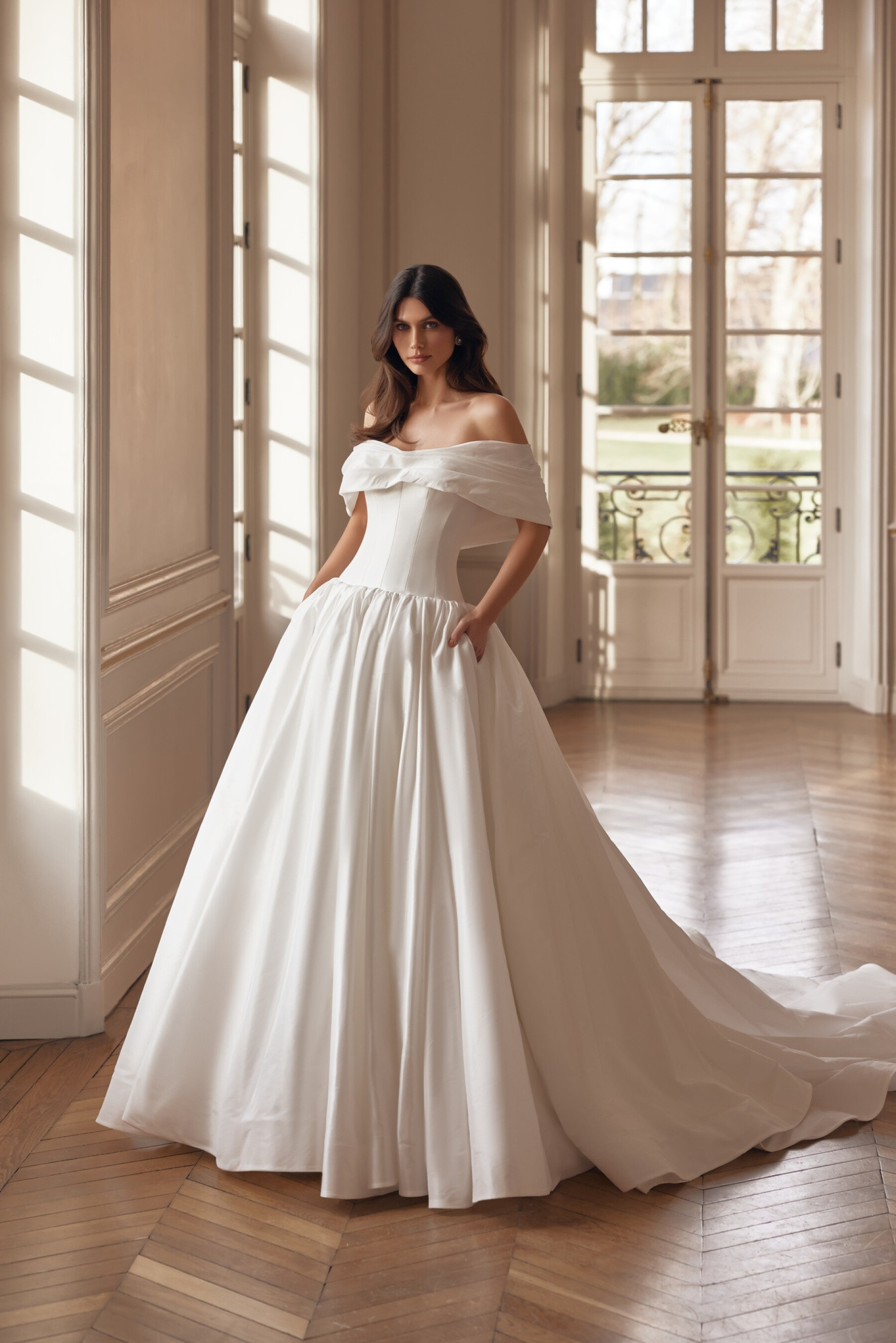 A striking voluminous gown in Ivory taffeta combines drama and delicacy in every detail. The corset with a “sweetheart” neckline is adorned with draping that softly continues onto the shoulders, forming delicate short sleeves. The full skirt with gathers and a long train creates a truly royal bridal look. A version with a shorter train is available.