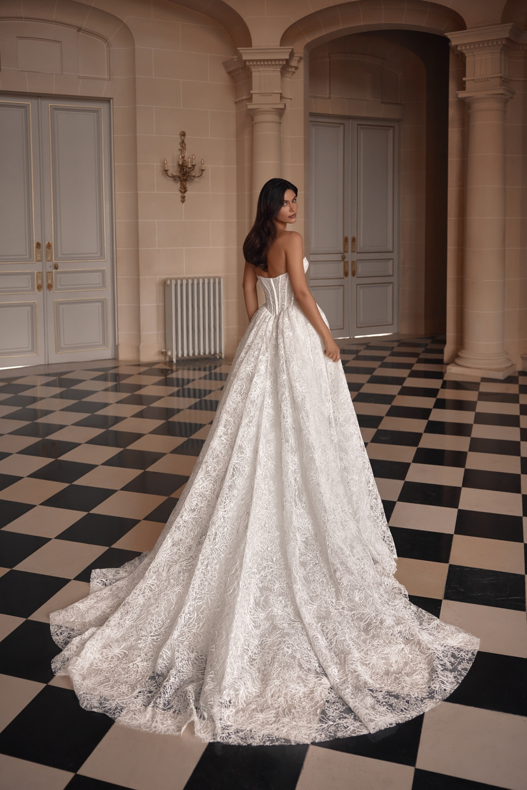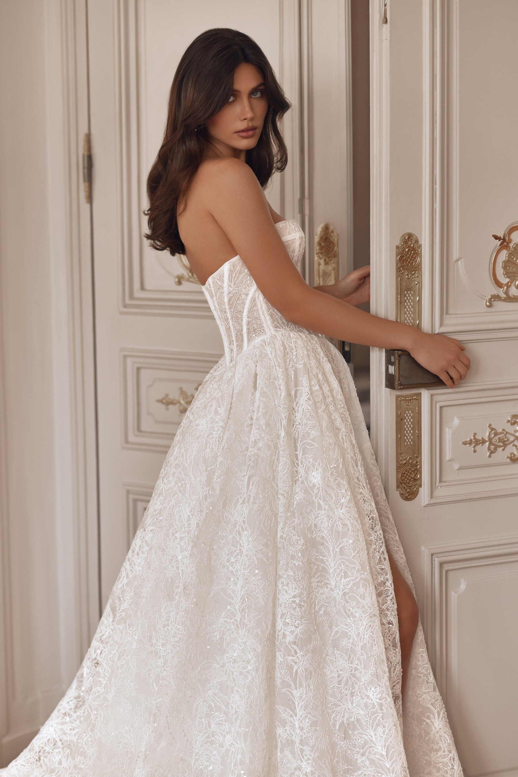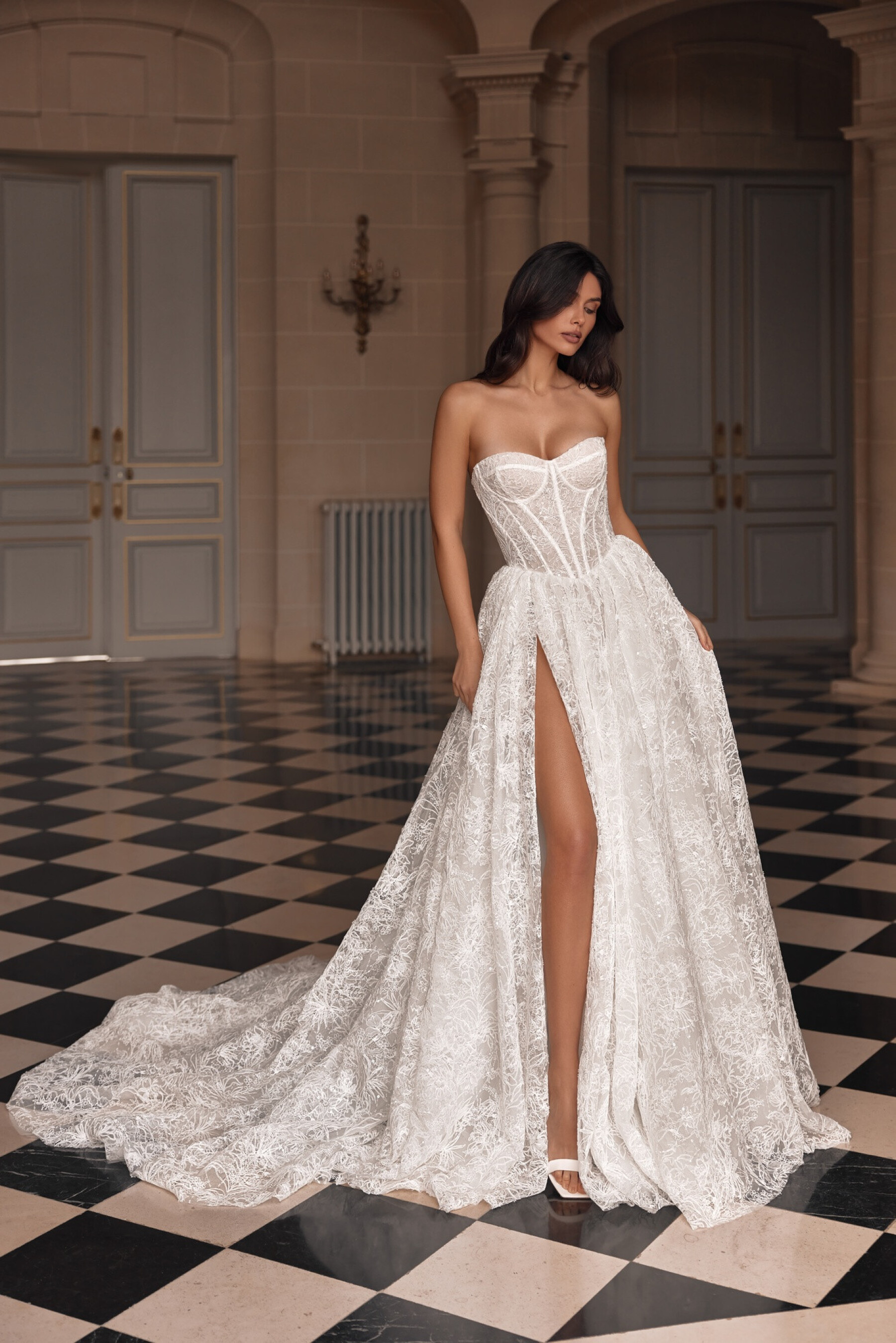 An A-line gown in Ivory with a semi-sheer sweetheart corset in embroidered lace. The bodice is accented with satin strips highlighting the structural lines. The slightly concave back below the shoulder blades has hook-and-eye closures. The full lace skirt with a long train features a right-side slit. The shaped seam is decorated with fine gathers. A lined skirt version is available.
