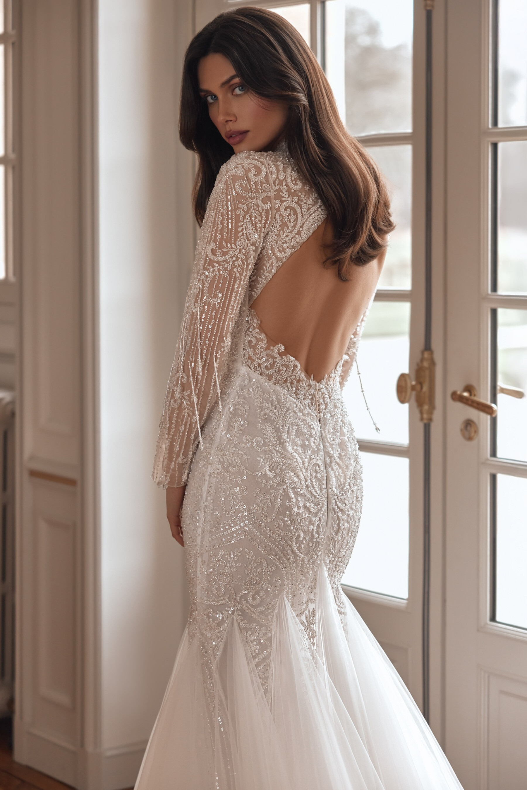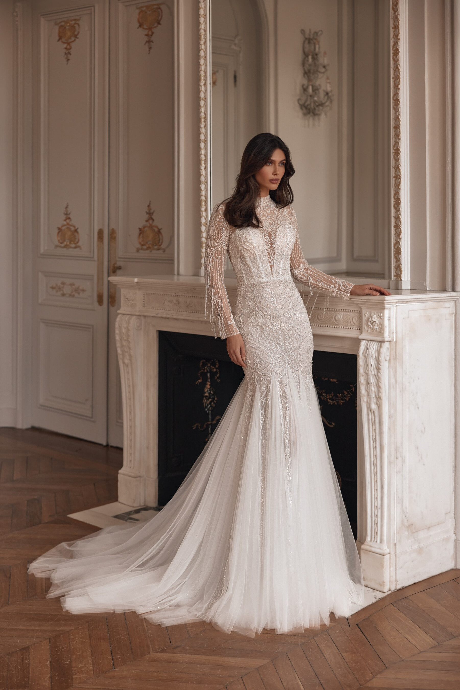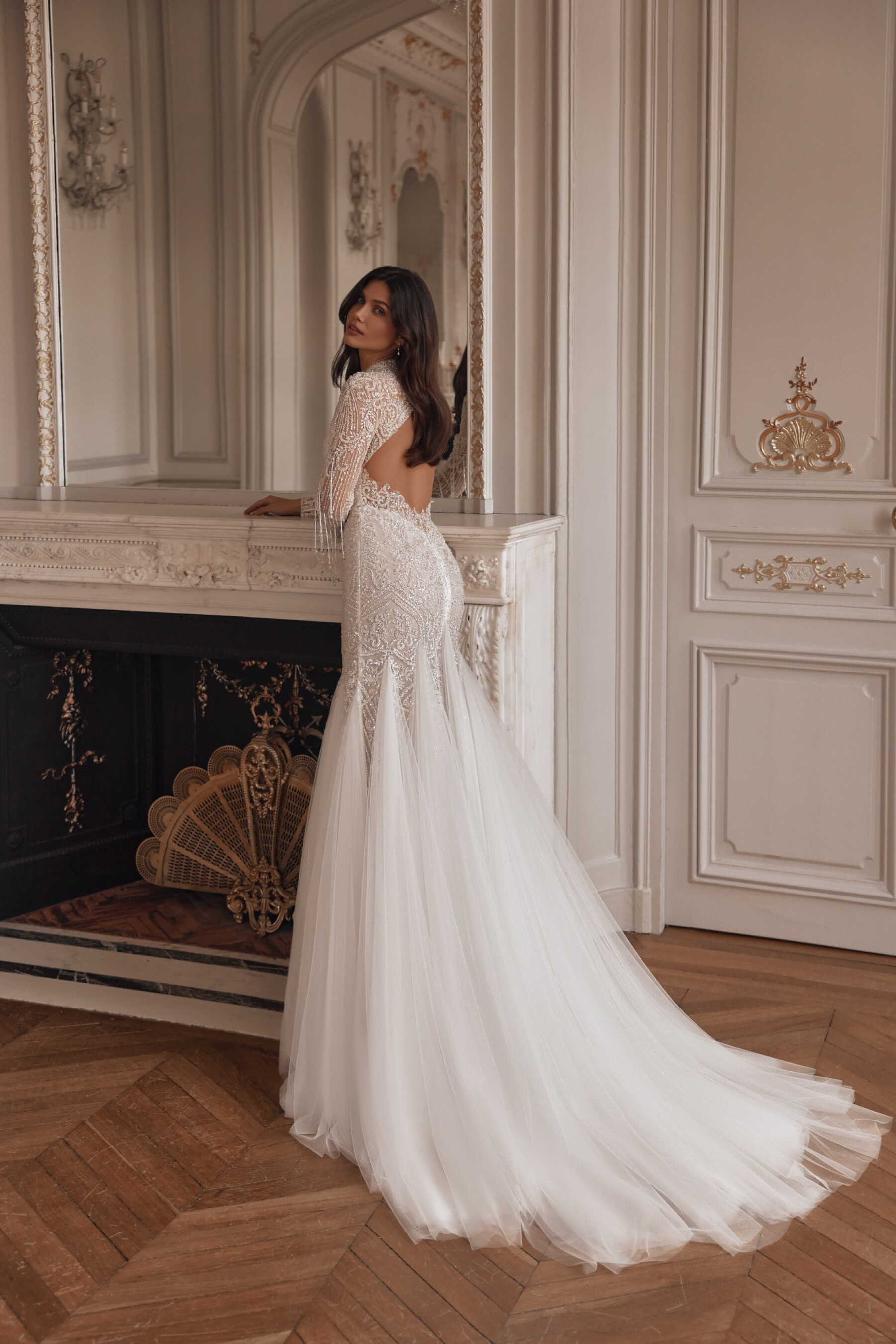 A mermaid silhouette gown in Ivory with a semi-sheer corset featuring a V-neckline and a mock-neck lace tank top. Long lace sleeves with wrist closures add gracefulness. The back has a diamond shape combining lace and nude mesh, adorned with appliqués. The fitted lace skirt with a train features tulle panels at the knees, adding volume. A lined option is available.