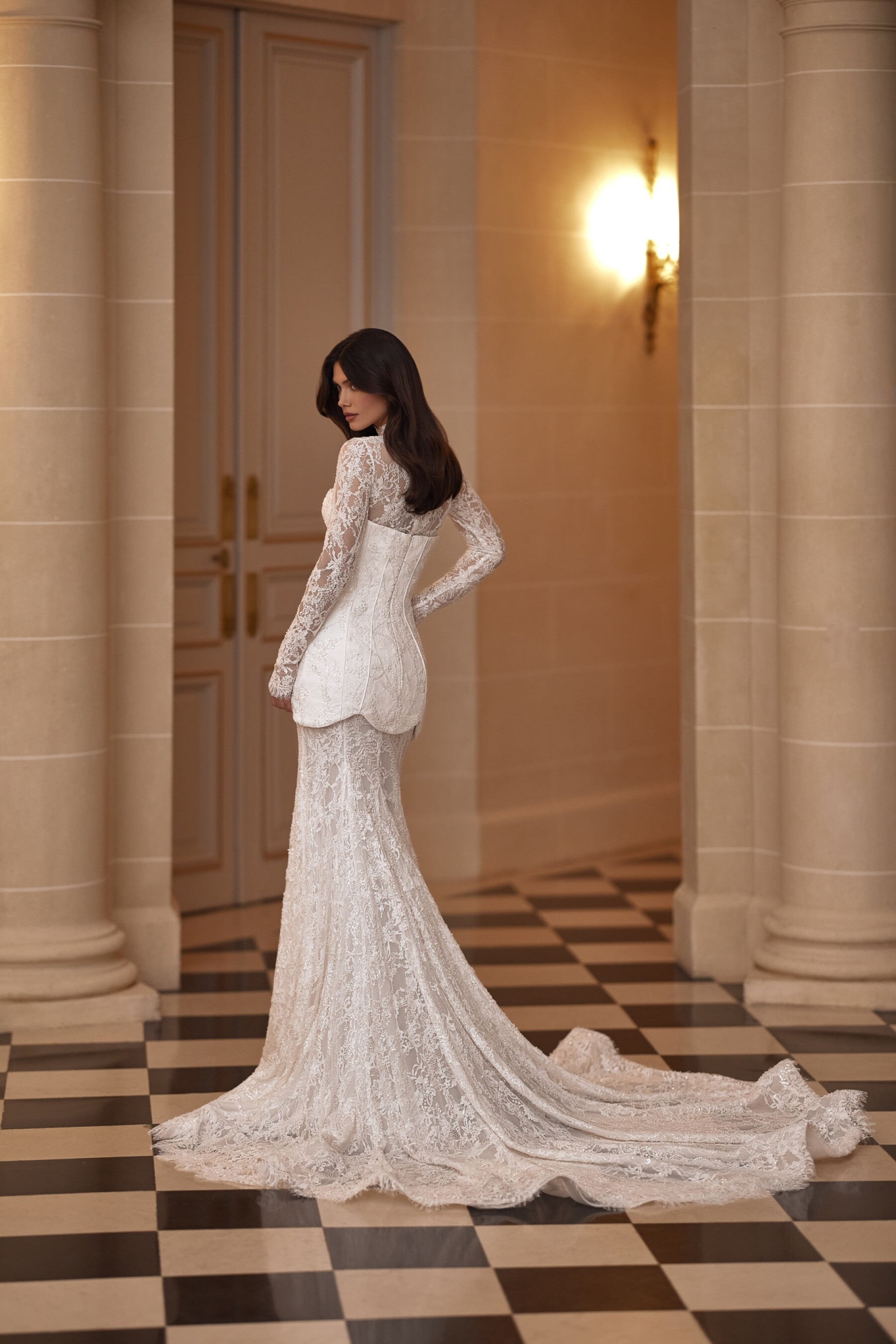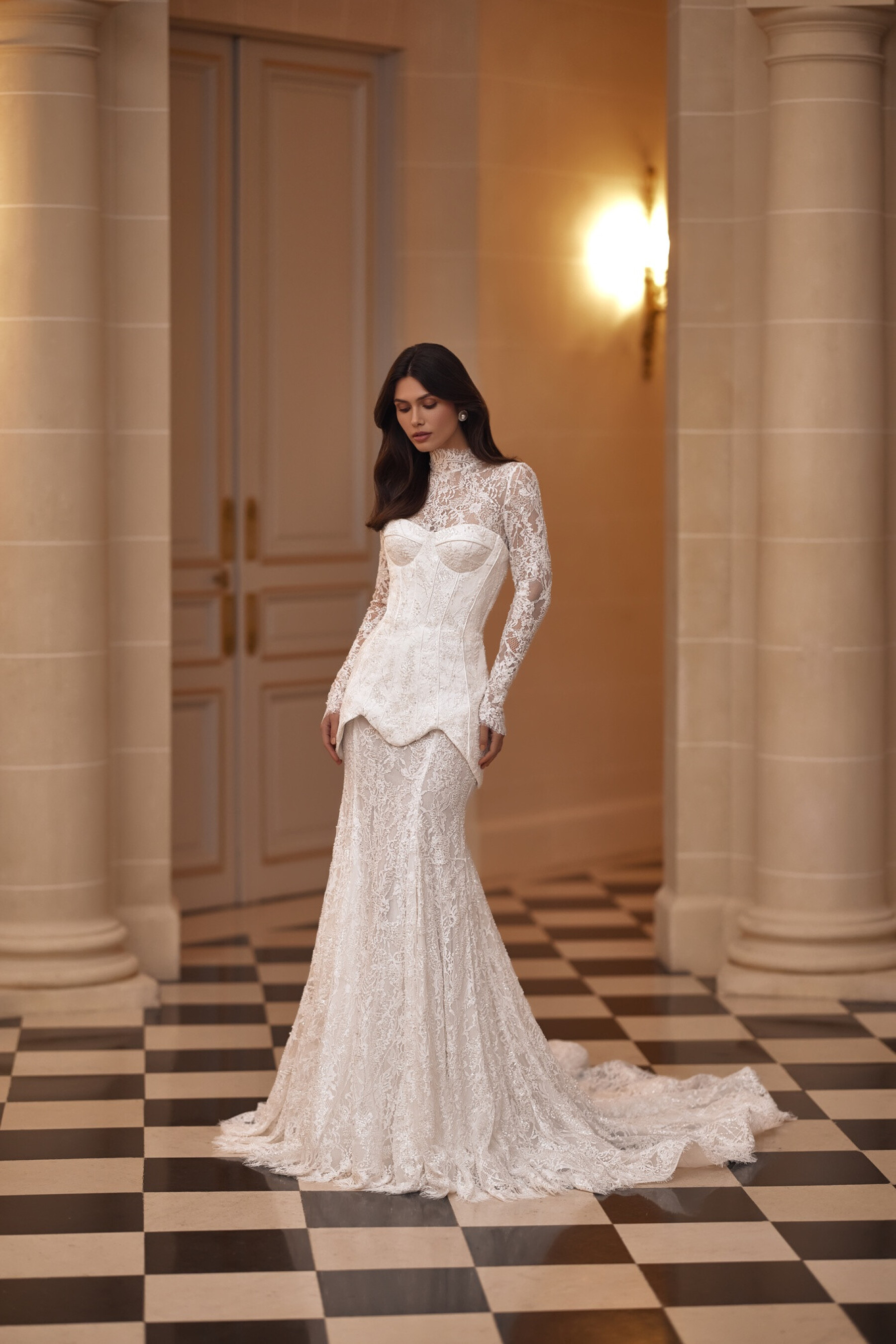 A semi-sheer mermaid silhouette skirt made of embroidered lace hugs the figure, emphasizing its natural grace. The fitted shape and lace scalloped hem create a subtle train effect and add a romantic, mysterious touch. A version with lining is available.