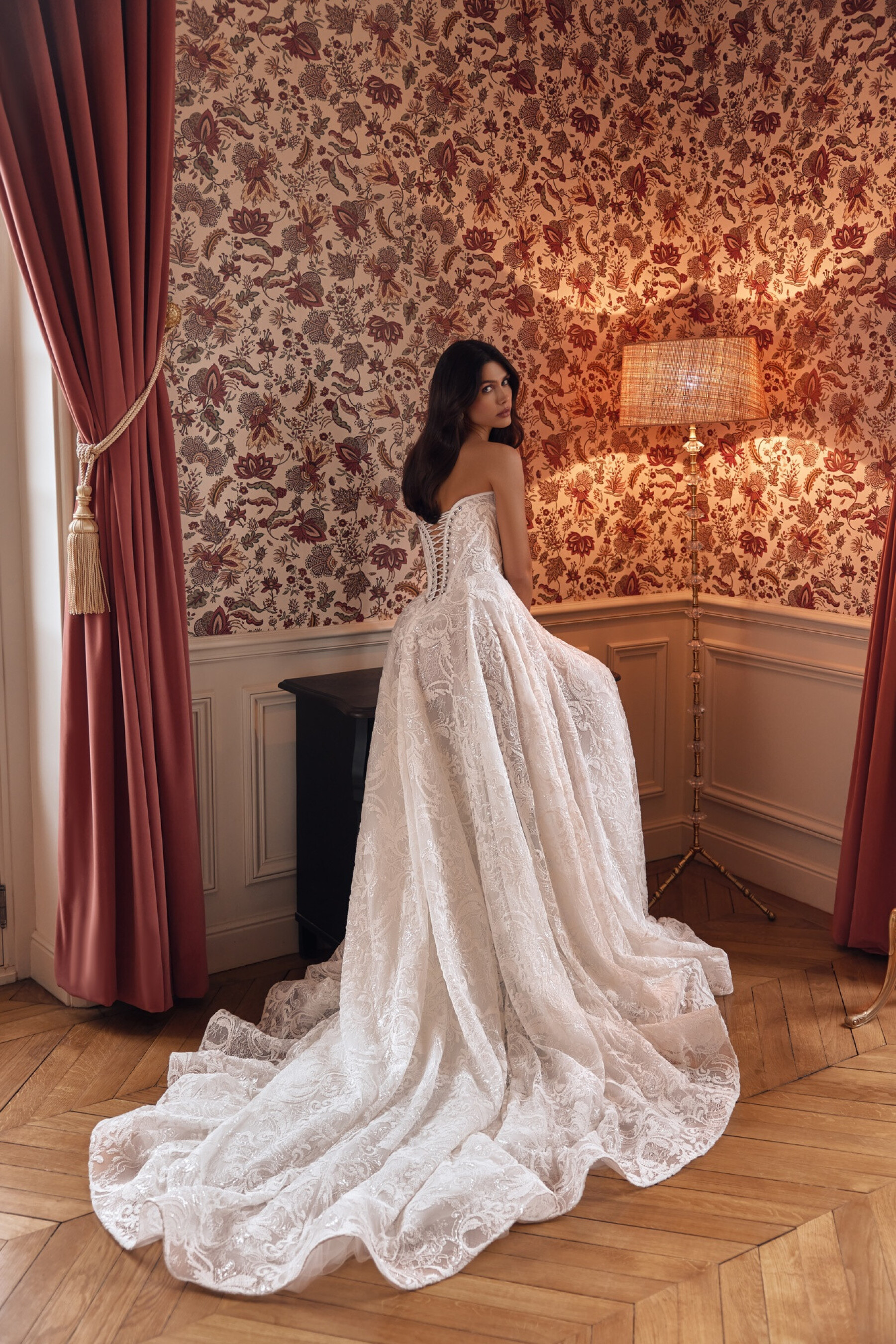 The full skirt with a train has a lace top layer, and the shaped seam mirrors the bodice curves for harmony. A concealed back zipper ensures perfect fit.