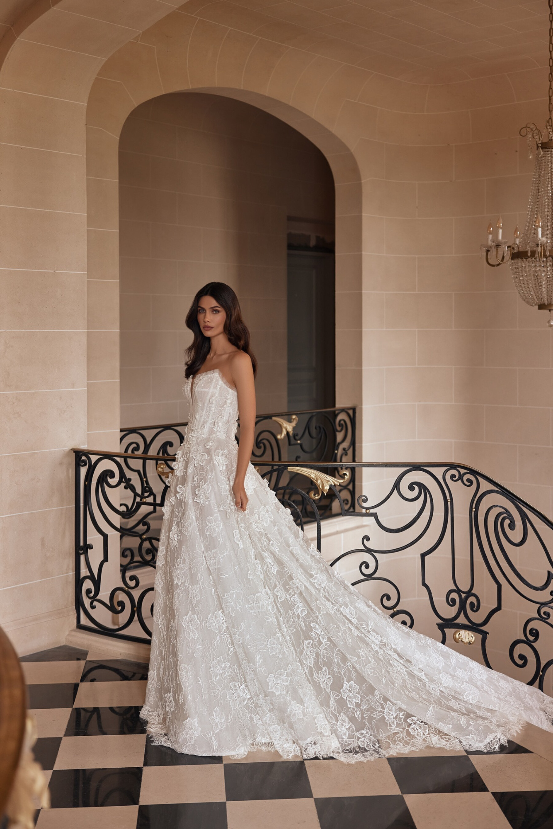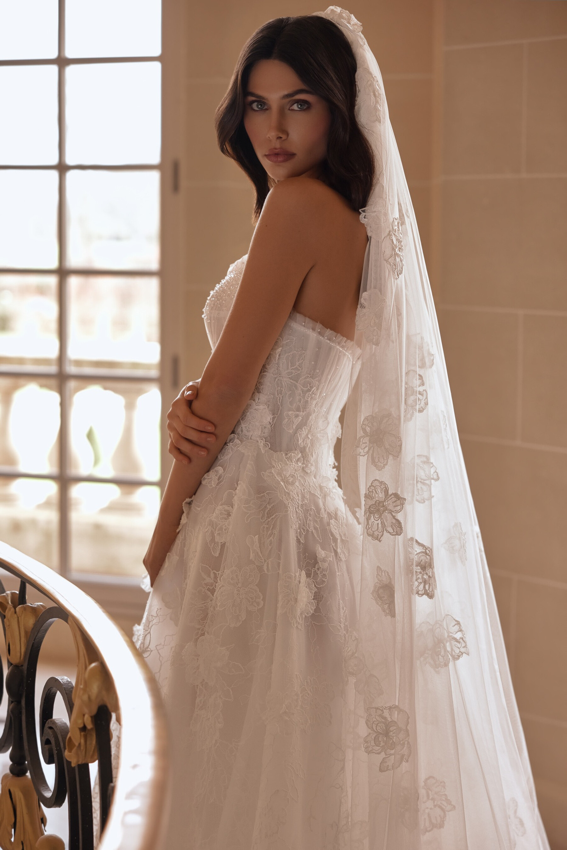 An A-line Ivory gown combining lightness of fabric with rich decorative details. The semi-sheer boat-neck corset features a central nude mesh insert softly framing the bust. The slightly concave back below the shoulder blades with concealed zipper enhances grace and flow. Vertical mesh draping on the corset forms a ruffle at the top edge, while 3D appliqués and hand embroidery create an elegant layered texture. The full skirt with a train has a lace top layer adorned with 3D appliqués. The shaped seam mirrors the bodice silhouette for a complete, harmonious look. A central concealed back zipper ensures perfect fit. Lined option available.