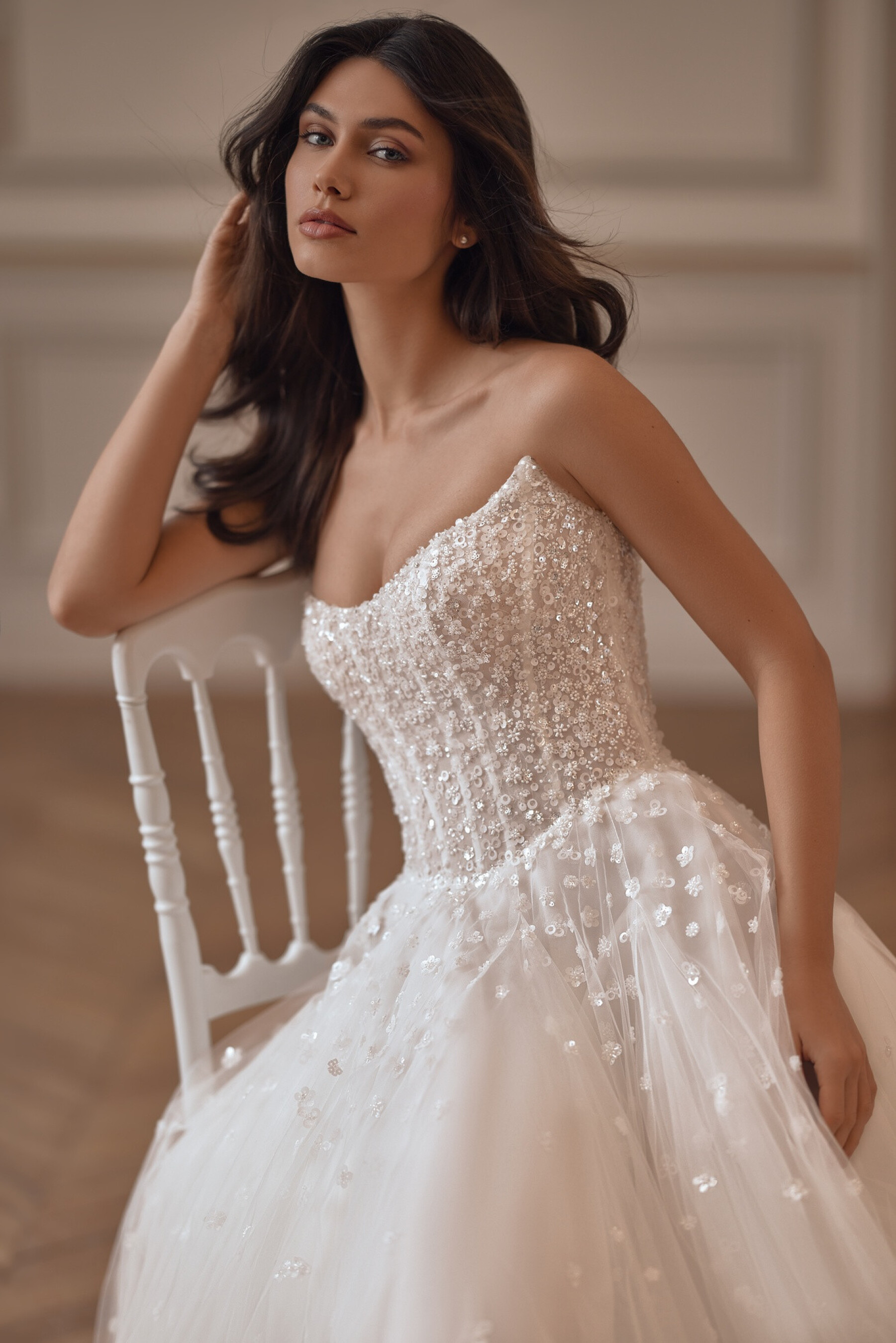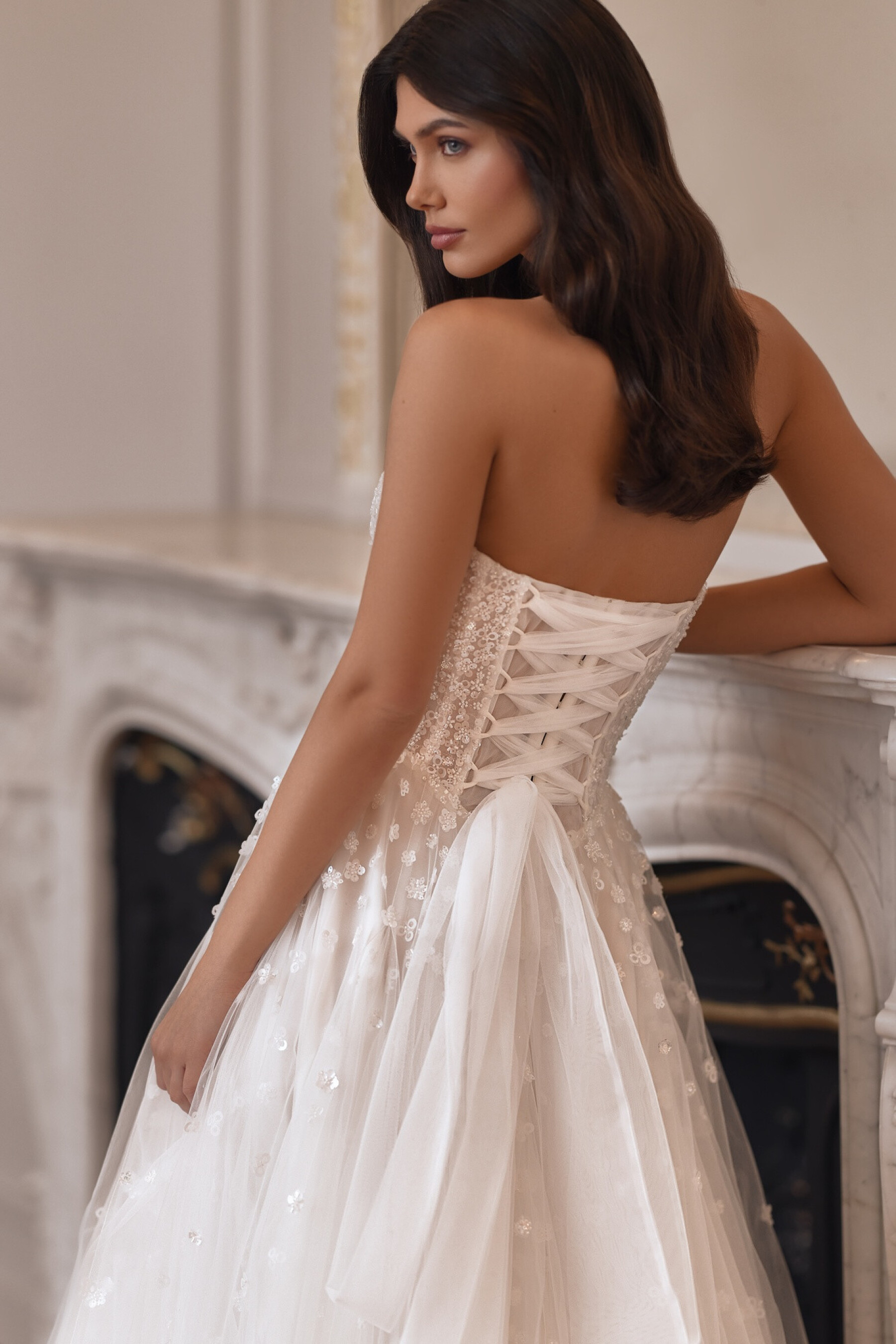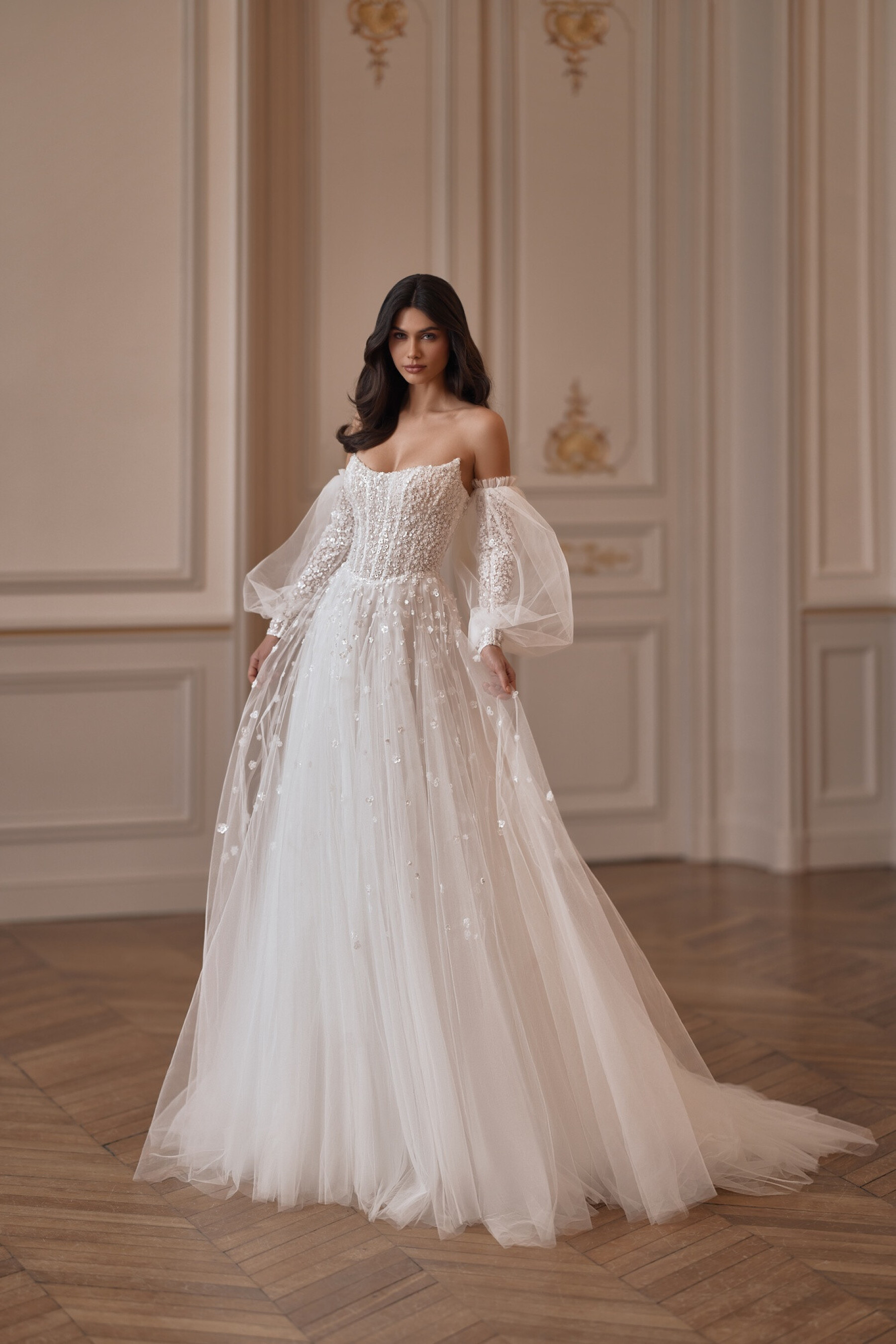 An A-line gown in Ivory with incredible airy volume. The semi-sheer embroidered lace corset features a delicate boat neckline and a slightly concave back below the shoulder blades, covering the waist and emphasizing graceful lines. A concealed central back zipper is complemented by loops for a full tulle lacing, creating a light corset structure. The full skirt, made of layers of tulle with inserted panels and appliqués, forms harmonious volume. The shaped seam of the skirt is highlighted with embroidery. The look is completed with 3466SL sleeves: a voluminous tulle outer layer and a fitted lace inner layer, creating a charming dimensional effect.