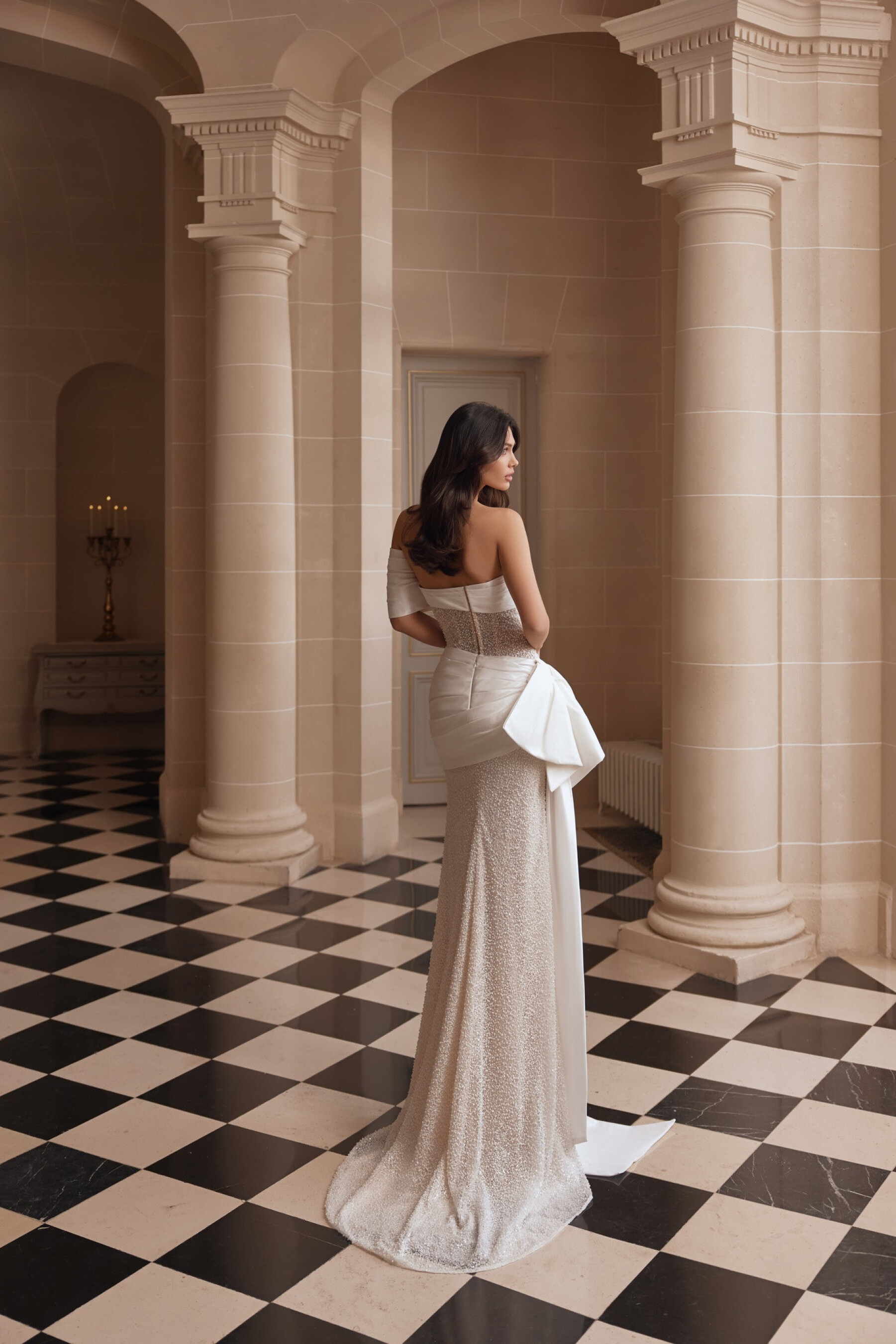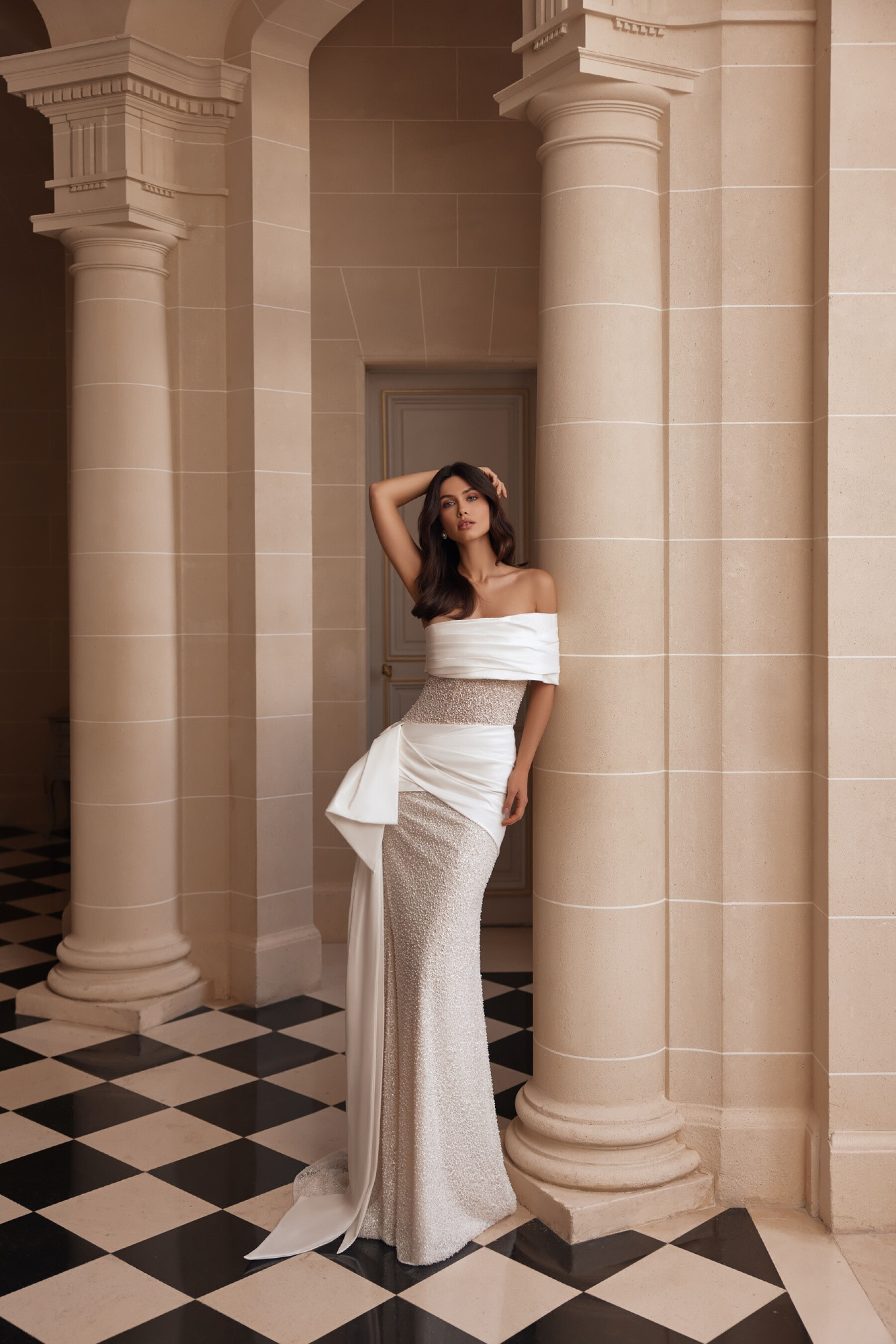 Sensuality and elegance are combined in this mermaid silhouette gown in embroidered lace in light skin, accentuating the natural beauty of the figure. The semi-sheer straight corset creates the effect of lace patterns on the skin, while tafta draping along the upper edge flows onto the shoulders and back, forming a sophisticated accent. The fitted skirt with a small train hugs the silhouette, emphasizing every movement, while diagonal draping on the hips adds dynamism and sculptural form. A large bow with long tails on the side seam provides a dramatic accent at the back. A version in Ivory is available.