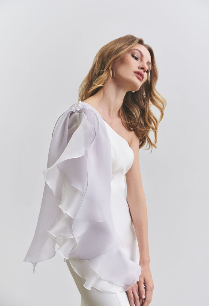 When your element is happiness, and your perfect dress is from the Liretta collection. This model stands out with a special tenderness that is present in every line, in fabrics and in details. The dress of the fitting silhouette is made of silk costume fabric, translucent organza and stretch lining. The accent detail is an asymmetrical bodice with a shoulder strap on the right shoulder (one-piece with a skirt). The bodice is decorated with organza flounces on the right shoulder and embroidery.