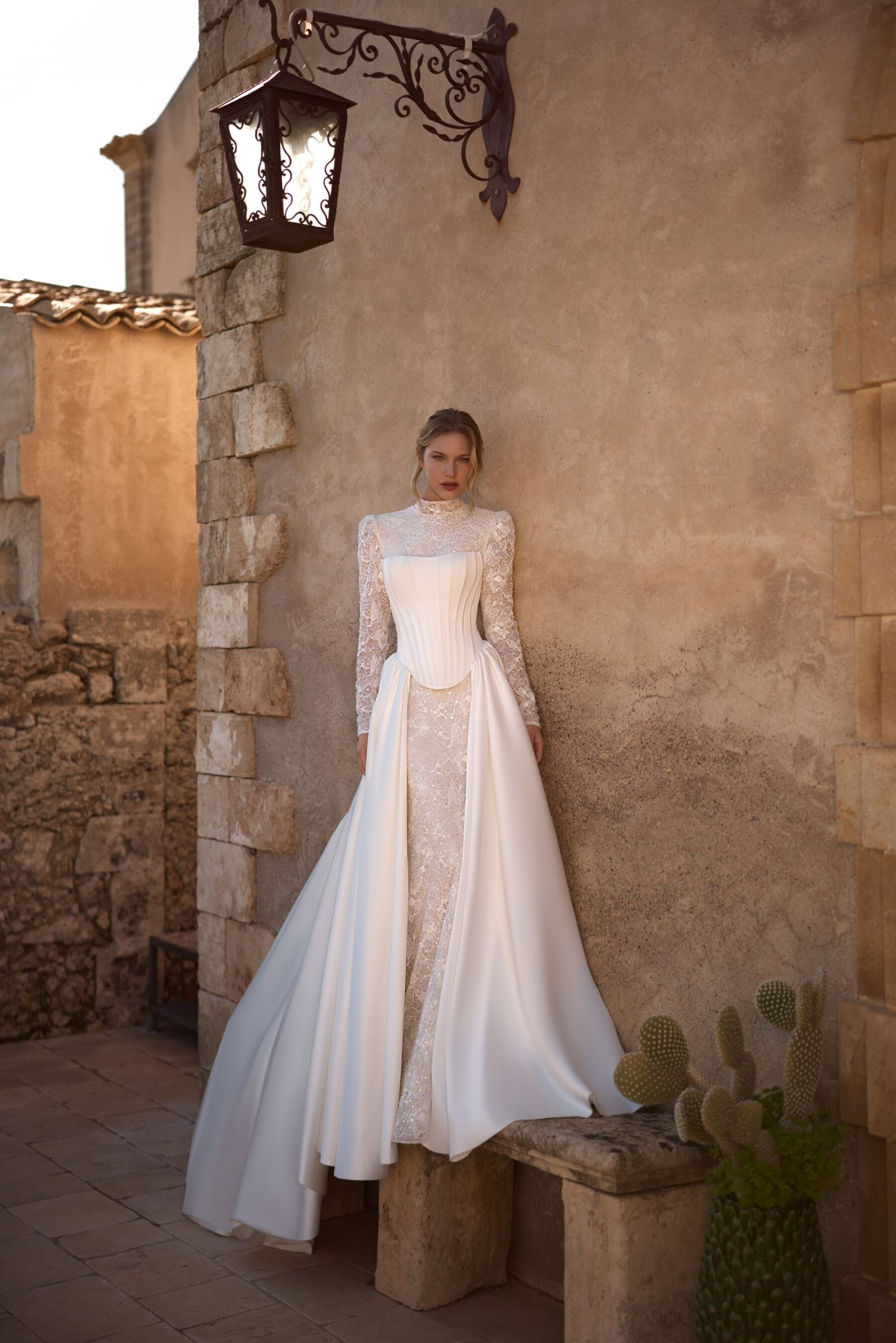 This festive piece of clothing that consists of a corset and a princess-cut dress in ivory color, made of embroidered lace and satin, will be perfect to complete the bride's look and make her look impeccable during the wedding ceremony. The corset is made of satin fabric, has a boat neck, the structural lines of which are accentuated by satin stripes. The back of the corset is made of the main fabric, is slightly concave, the structural lines are decorated with satin stripes. The corset has a hook-and-eye closure in the center of the back. A puffy train made of satin fabric is sewn to the corset. A hidden zipper closure is in the center of the back panel.