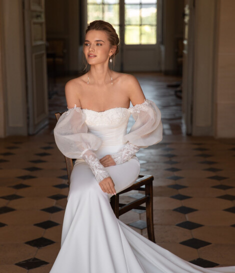 And then another special moment begins. When among hundreds of wedding dresses, you see and choose the one. You will recognize it by touch, by the tenderness of fabrics, by the grace of the silhouette. By the way your eyes start to shine, by your special smile when you put it on. By the fact that you imagine how he will look at you. It is not the main decoration of your special day. It is the perfect complement to you, your mood and your feelings, your image — the image of a happy one and in love. In love with him, with your dress, with your look of a dream bride, with your common happy future.