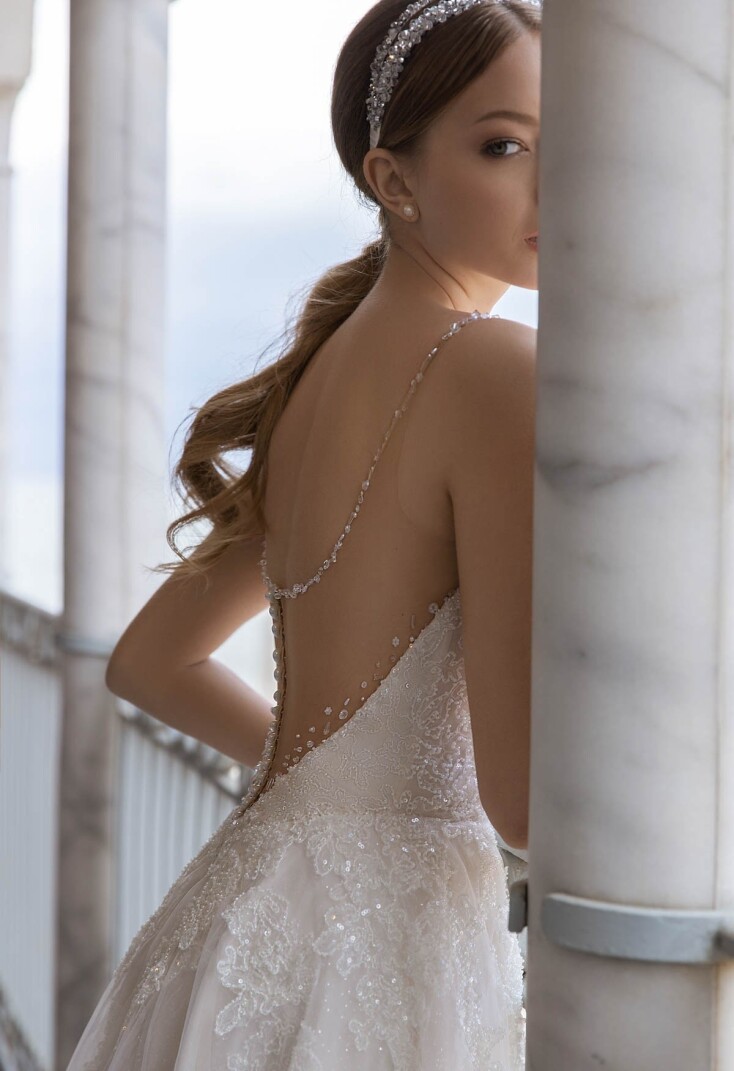 A glorious dress on thin straps with a low neckline. The corset of the dress is manually embroidered with shining stones, spangles and crystals. The skirt shines beautifully in the sun. A long train and lace insert on the waistline look very elegant.