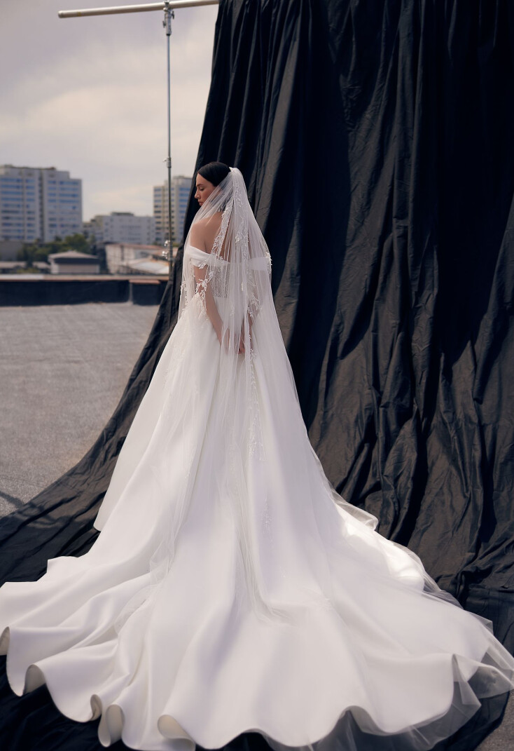 For a fastidious bride who wants to combine royal chic, seductive sexuality, classics and creativity in her wedding outfit, this A-line ivory dress made of the Mikado fabric will be perfect. The translucent corset with a heart-shaped neckline is trimmed with decorative inserts of the Mikado fabric. The top is decorated with embroidered 3D appliqués. The back is slightly concave below the shoulder blade line. There is an expander hooks fastener in the center of the back. Decorative puffy straps made of the Mikado fabric cover the forearms. A fluffy skirt with a luxurious royal train made of the Mikado fabric has a seductive slit in the center on the front, due to which the bride's slender legs will appear effectively while walking. Along the upper section, the details of the skirt are laid in folds, which create a textured volume. The upper layer of the skirt is decorated with embroidered appliqués that smoothly pass down from the corset. This dress is also available without a slit in the skirt.