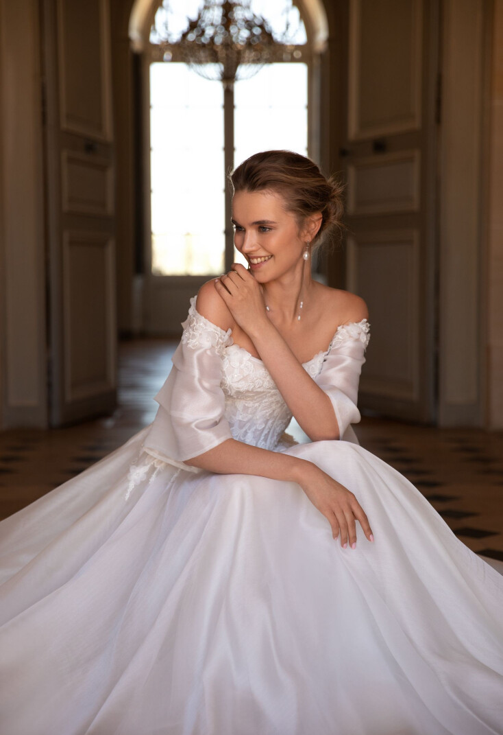 Every girl dreams of becoming a real princess. And this dream comes true as soon as she meets her prince. But on the wedding day, she is a princess for everyone! Even for strangers who become casual witnesses of the celebration. The A-line Claire dress with a full skirt and train gives the bride a royal charm. Delicate shine, embroidered appliqués and 3D flowers emphasize fragility, add sophistication to the image. The V-shaped backrest aesthetically opens the shoulder blades and emphasizes the beauty of the body. A translucent corset, a boat neckline and organza sleeves are important accents that make the dress truly royal.