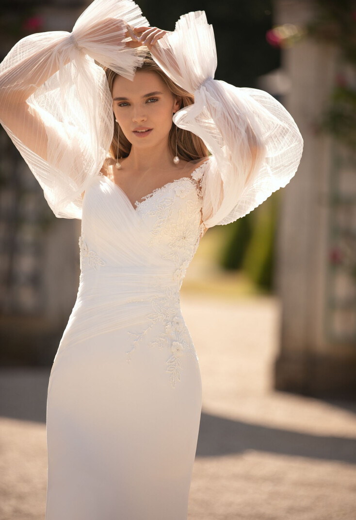 It is a combination of sexuality and tenderness, passion and romance. The silhouette of the "mermaid" made of costume fabric seductively falls on the body. The heart-shaped neckline, the nude back and the adjacent shape of the dress in the hip area are a real temptation. Thanks to this, every bride will feel feminine. And the romantic colors in the image are given by embroidered 3D appliqués that smoothly transition to the shoulder and back, drapery made of Plisse mesh and expanded sleeves at the bottom. Isabelle gives the bride a special energy.
