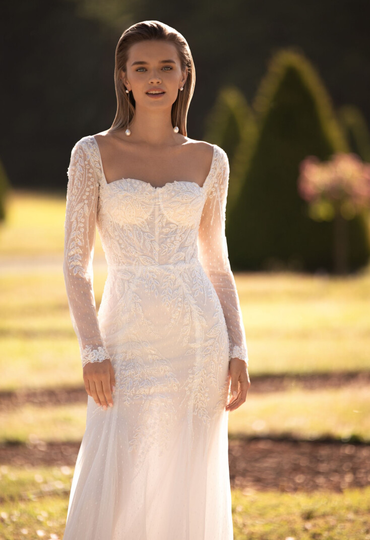 The Suzy dress of the mermaid silhouette with long sleeves creates an effect of sophistication. It conveys charm and majesty. Beaded lace with floral motifs is created according to the latest trends. The tank top of the dress with a square neckline on the front and on the back makes the image more luxurious. And the fitted skirt with vertical reliefs on the front and back makes the bride feel seductive. Buttons on the back and on the sleeves are hand-embroidered with crystal and beads and successfully fit into the overall mood of the product.