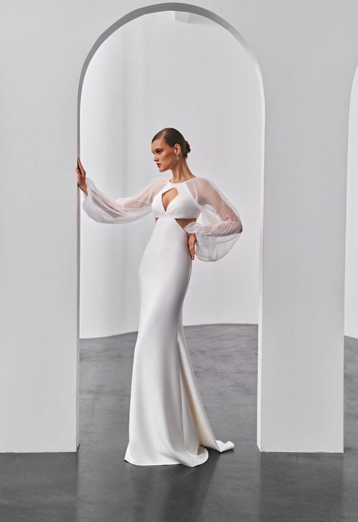 The dress from your dream-list has become a reality. Everything is perfect in it: from the fitted silhouette and materials to the refined details. It is made of amazing matte ivory suit fabric, pleated mesh and stretch lining. The neckline is round, in the centre of the bodice there is an exquisite drop-shaped cutout. Under-breast cut has transparent mesh panels on the sides at waist level. A wide long raglan sleeve makes the image even more sensual. The back of the dress is half-open, with a boat neck and a curly neckline in the center, transparent mesh inserts on the sides at waist level. Close-fitting fishtail skirt has a wedge on the back half and a zipper as a fastener. The length of the skirt from the waist is 120cm, the length of the train from the waist is 136cm. The dress fastens with buttons in the center of the back.