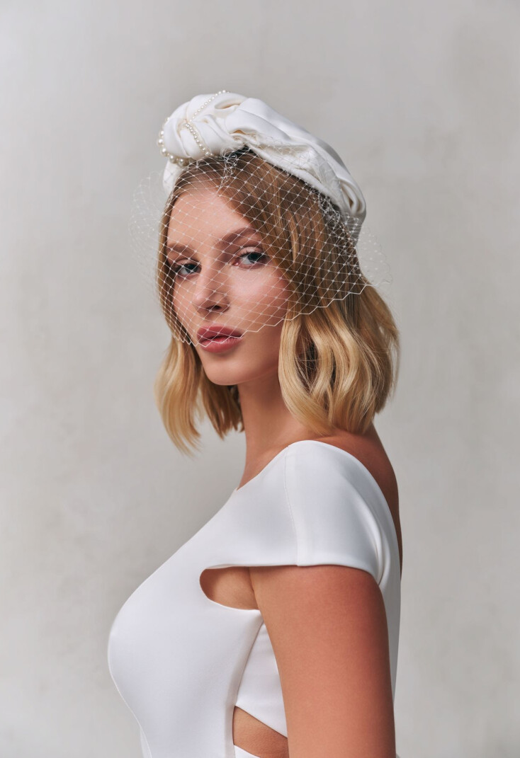 The luxury of lines and the elegance of silhouette. The Bellessa dress is the epitome of sophistication and style. The model of the fit silhouette is made of glossy ivory costume fabric. In front there is a boat-shaped neckline, decorated with pearl beads, along the neckline there is a transparent insert made of flesh mesh. The back is open, V-shaped, with long knotting elements. The A-line skirt is semi-fitted. The length of the skirt from the waist is 120cm, the length of the train from the waist is 170cm.There is a hidden zipper in the center of the back of the skirt, the lower part of the tank top is buttoned.