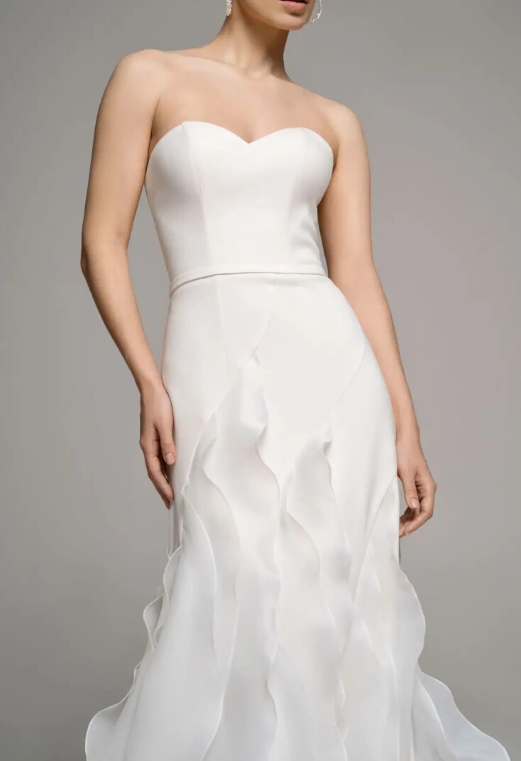The delicate and laconic silhouette of the fish wedding dress is ideal for brides who prefer a restrained modern classic. The dress is made of snow-white suiting fabric, which looks dazzlingly beautiful in the sun. The plain, minimalistic corset is made in the shape of a heart, and the waist is decorated with laconic belt. The skirt is the main decoration of the dress. The curly seams with sewn-in organza flounces give the lower part of the dress the effect of soft waves. The corset is tightened with the help of lacing, and the skirt has an invisible thin zipper.