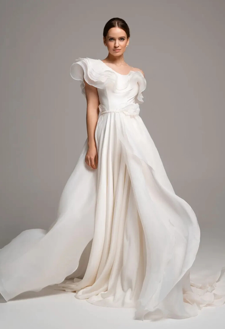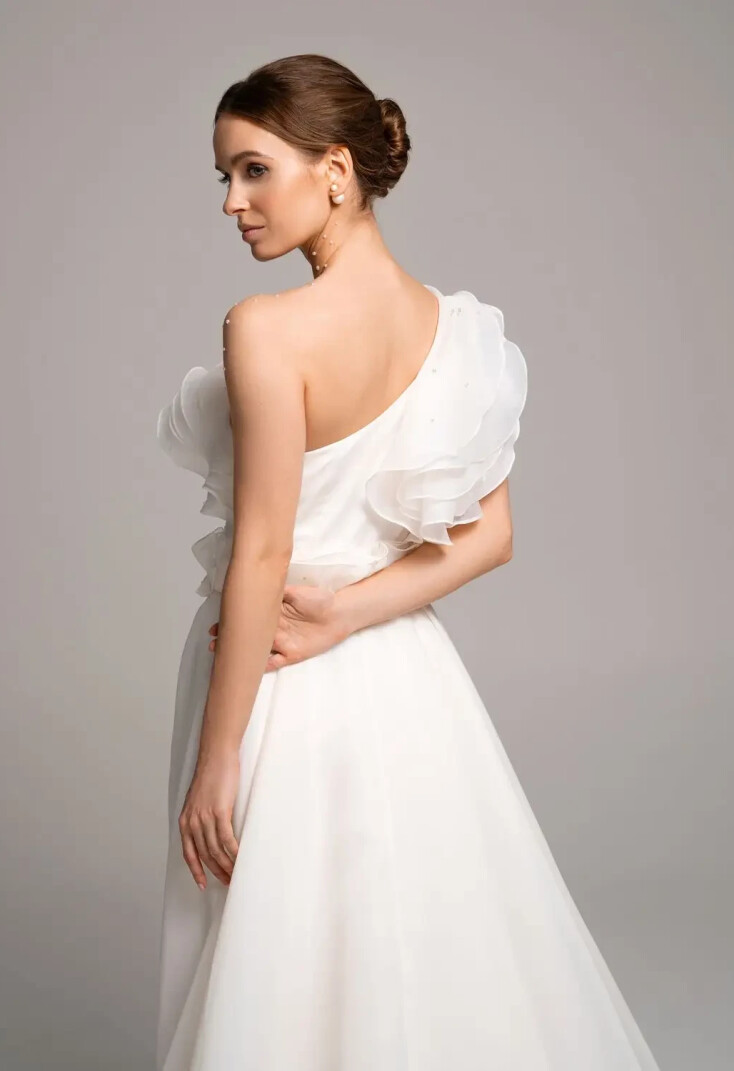 A luxurious, airy A-line dress wraps the figure like a cloud. The asymmetrical one shoulder bodice looks incredibly soft and feminine due to organza flounces. A scattering of pearls creates an interesting spectacular accent on the bodice. The skirt has an original cut with elements that have curly edges in the front, which creates a weightless flying effect. Decorative drapery smoothly flows from the skirt to the bodice, creating a single harmonious look. Like the bodice, the belt of the dress is decorated with glittering pearls. The fastening is hidden in the side seam of the dress.