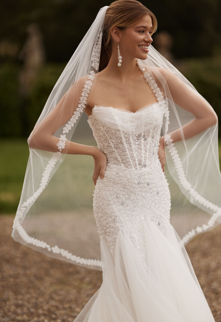 A mermaid silhouette wedding dress in ivory color is the perfect choice for a bride who wants to have an incredibly beautiful and elegant look. The corset of this dress is semi-transparent and is made with a boat neck in front. The back is concave in shape. The top is decorated with lace and embroidered 3D appliqués and sequins, through which you can see a delicate shine. There are also elements of mesh drapery. The corset is fastened in the center of the back with extension hooks. The skirt of the dress has a luxurious train and is tight-fitted in the hip area. The upper layer of the skirt is made of lace and decorated with embroidered 3D appliqués, smoothly passing from the corset. The lower part of the dress is made of tulle wedges, which gives puffiness to the dress. The skirt is fastened in the center of the back panel with a hidden zipper. The look is complemented by removable light sleeves, which are decorated with soft drapery.