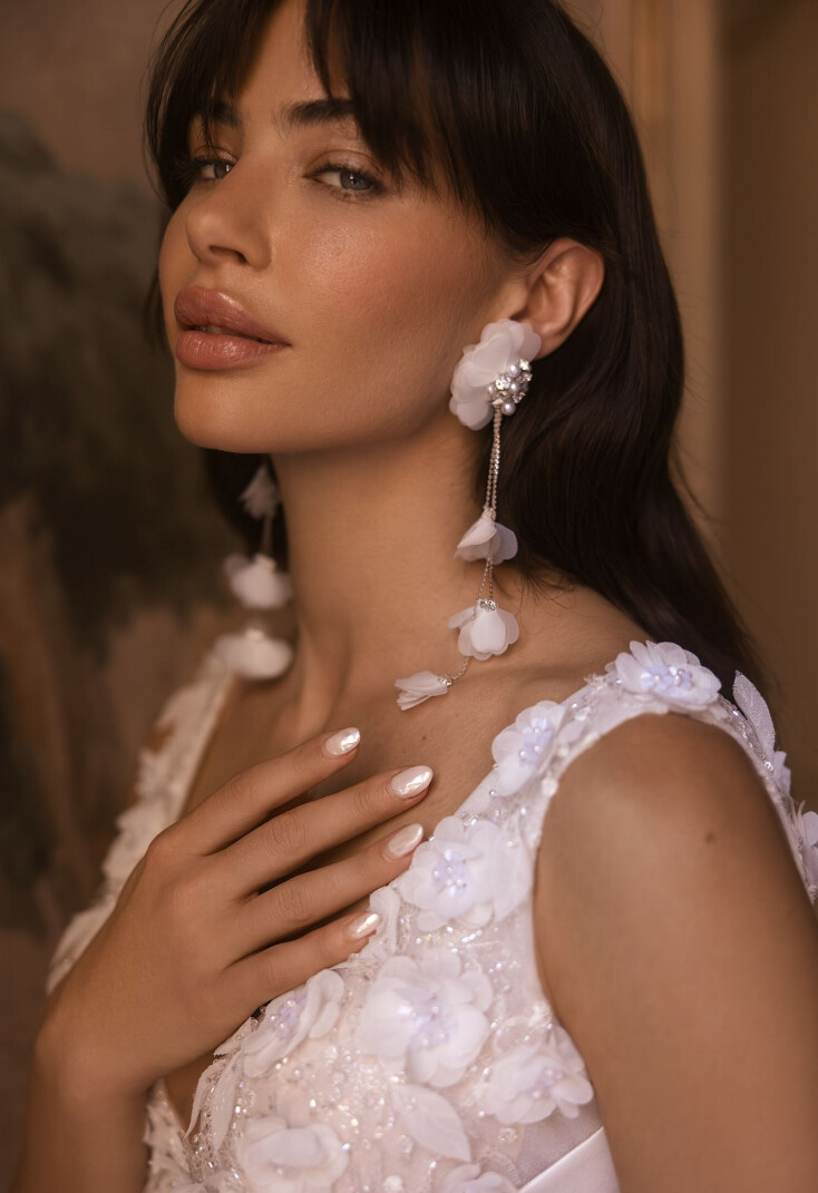 The mermaid silhouette dress in ivory color is the perfect choice for a fastidious bride who wants to emphasize the flawlessness of her figure and strives for festive splendor in her wedding dress. The corset of the dress is semi-transparent, has a V-shaped neckline in front turning into straps. The back is concave in shape below the level of the shoulder blades with a clasp on extension hooks in the center of the back. The upper part of the dress is decorated with embroidered 3D appliqués, and the lower part is decorated with diagonal pleats made of Mikado fabric, smoothly turning into a skirt. The skirt itself is tight-fitted in the hip area and is made of Mikado fabric. There is a hidden zipper closure.