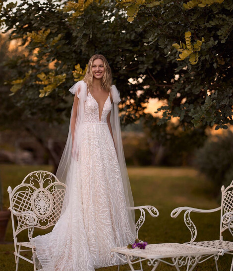 Класичні, і водночас зовсім не нудні – саме таку сукню подарувала фея на весілля Попелюшці. Ви впізнаєте нашу сукню за силуетом і деталями: відкритою спинкою, ніжним декольте, мереживом, що спадає, стеклярусом і вишивкою. Зустріч із нашою сукнею – це зустріч із мрією. Усі декорації та концепція торжества вибудовуються відразу ж, як тільки наречена побачила її на власні очі.