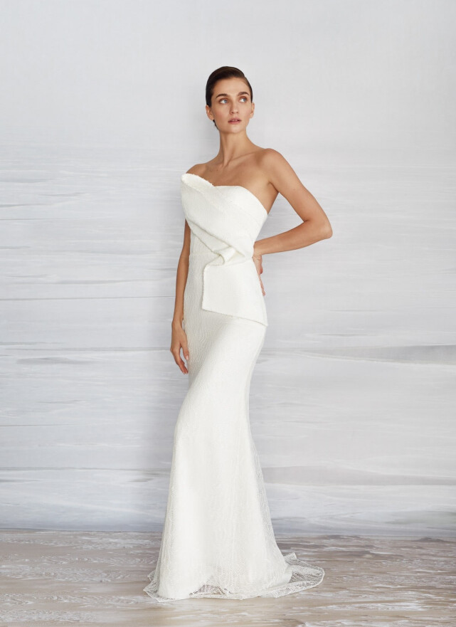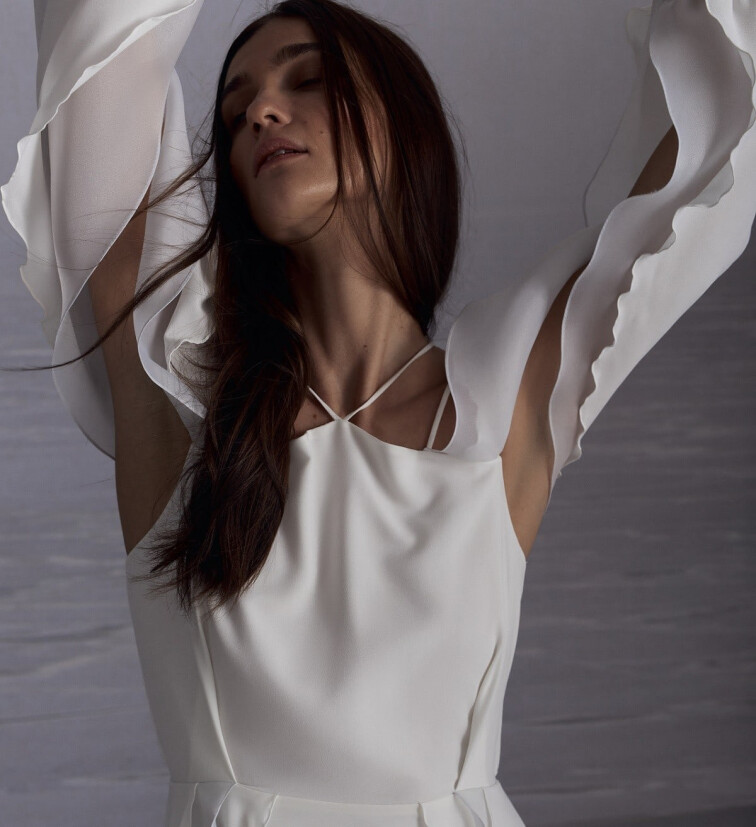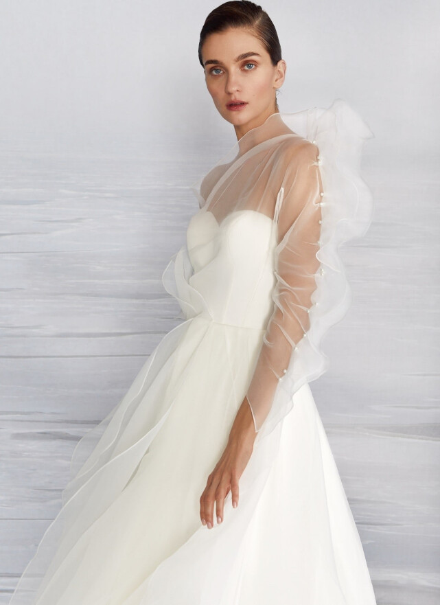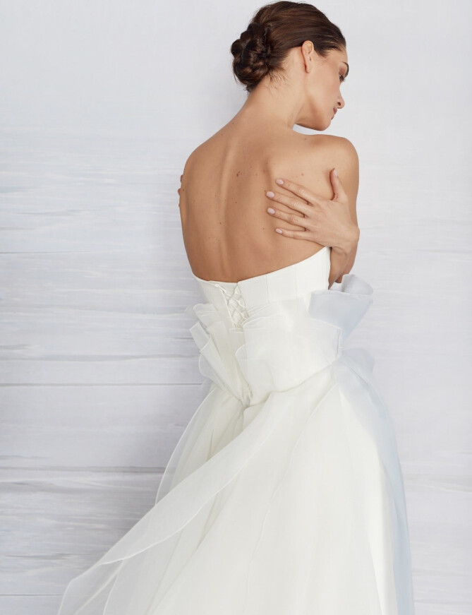Riptide - весільна сукня із двох видів органзи. Верх складається із корсета, декорованого невагомим драпіруванням, яке утворює комір і обрамляє відкриту спину в м'які збірки на талії. Об’єму спідниці надають багатошарові волани, зшиті по спіралі.