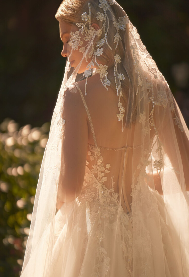Витончено граційна, тендітна і ніжна наречена матиме приголомшливий вигляд, якщо вибере елегантну сукню А-силуету в кольорі light skin. Корсет весільного вбрання, з ввігнутої форми спереду, виготовлено з V-подібним вирізом на спинці та на тонких, елегантно вишитих бісером, бретелях, а також вставкою з сітки нюдового кольору. Оздоблено корсет хаотичними складками та вишитими аплікаціями, що плавно переходять на верхній шар спідниці. Застібка по центру спинки на гачки-розширювачі. Спідниця сукні пишної форми із розкішним шлейфом, виготовлена з фатину. Другий шар спідниці виготовлено з блиску та декоровано вишитим мереживом. Застібка спідниці – потайна тасьма-блискавка. Дана сукня також можлива у варіанті Ivory. Доповненням до сукні може бути повітряно легке з’ємне болеро з крильцями на плечах, вузькими рукавами та ніжною вишивкою по них.