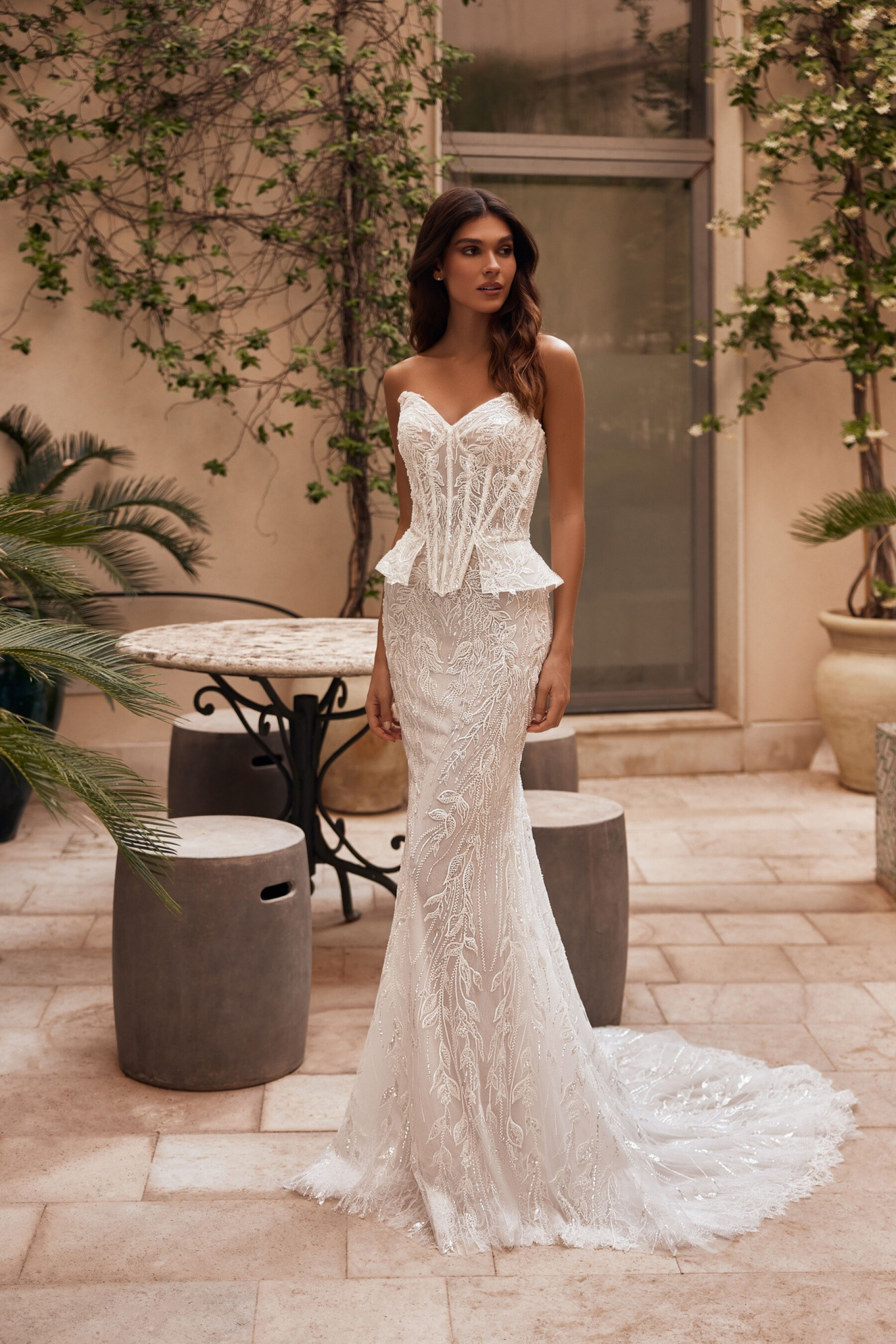 Прилегла спідниця зі шлейфом підкреслює плавність силуету – це справжнє втілення жіночності та витонченості. Вона виконана з мережива, оздобленого ніжним зубцем по низу, та прикрашена поясом на талії. Також спідниця доступна у варіанті з підкладкою.