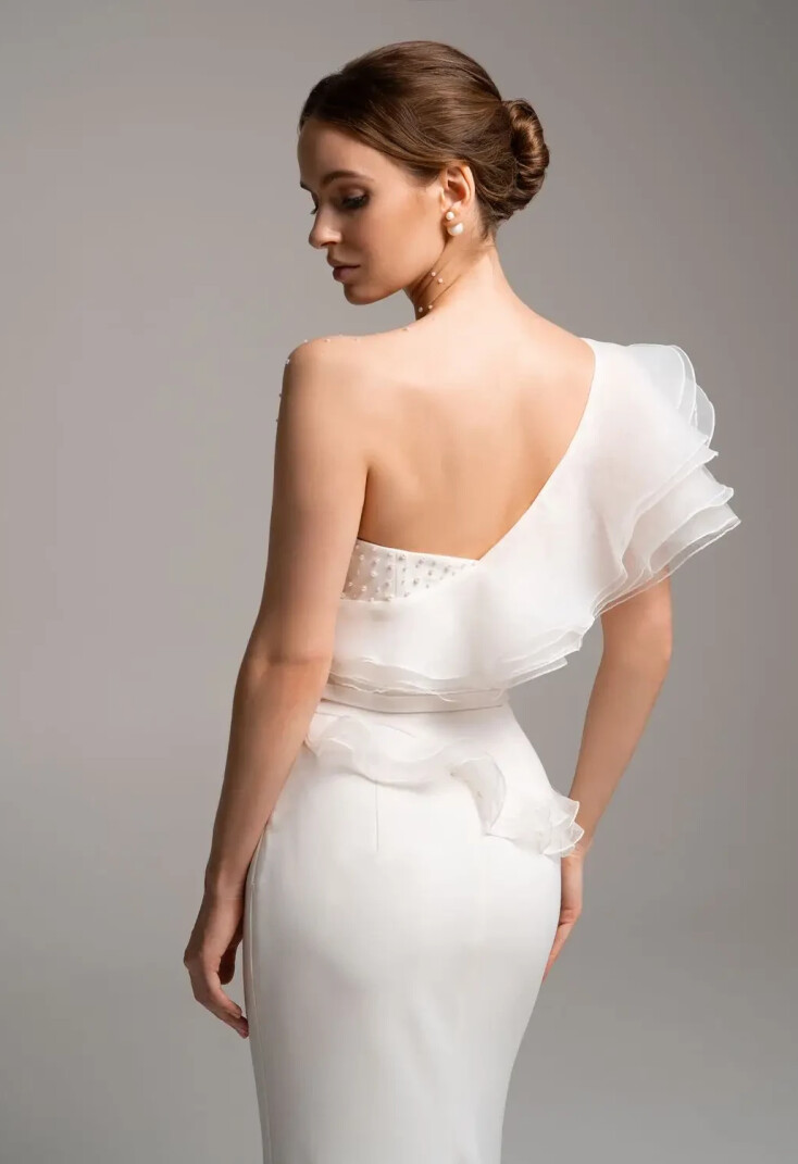 Элегантное платье силуэта рыбка поражает своей нежностью, которая удачно подчеркивается воздушной органзой. Верхняя часть наряда отрезная до талии. Изящный лиф в форме сердечка дополнен эффектной деталью из нескольких слоев органзы, которая закрывает его правую сторону и плечо, что создает выигрышную асимметрию. Левая часть лифа богато украшен декором из жемчужин. Юбка украшена смелым сексуальным разрезом по правой ноге, который задекорирован сеткой и воланами из органзы. Сетка телесного цвета и воланы создают эффект обнаженной кожи. Незаметная застежка спрятана в боковом шве платья.